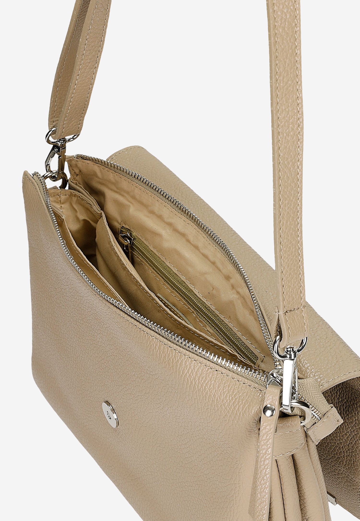 Ta beżowa torebka ze skóry licowej to idealny dodatek dla kobiet ceniących ponadczasowy styl i praktyczność. Uniwersalny odcień beżu doskonale komponuje się zarówno z eleganckimi, jak i casualowymi stylizacjami, tworząc harmonijne zestawienia na co dzień.