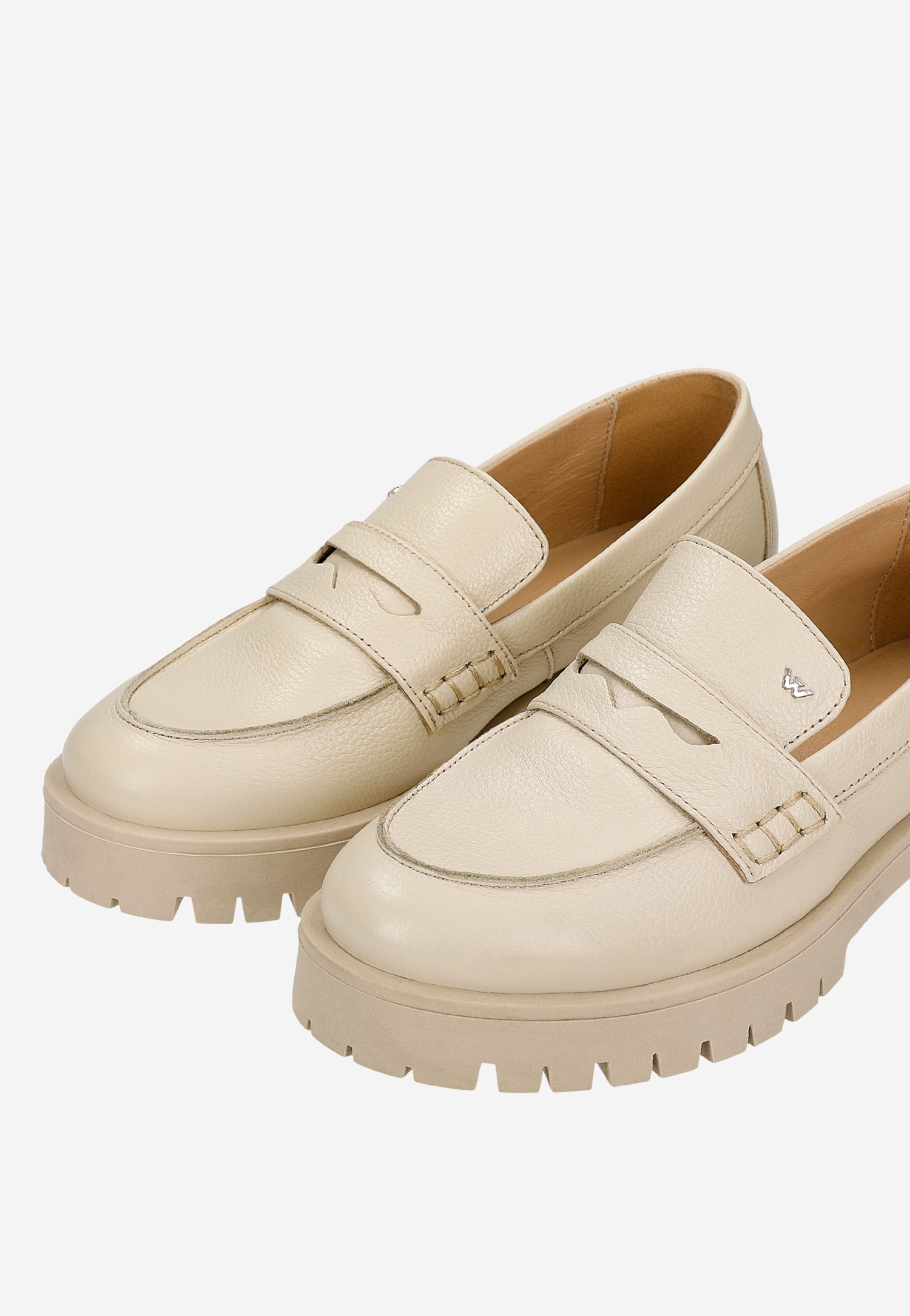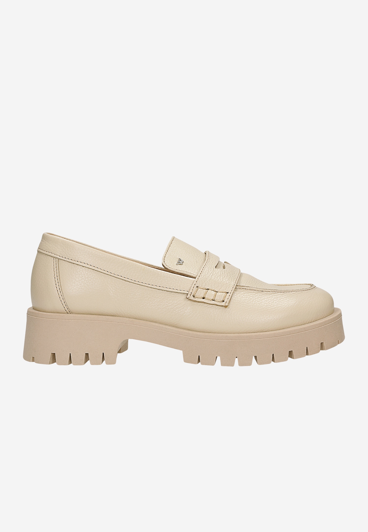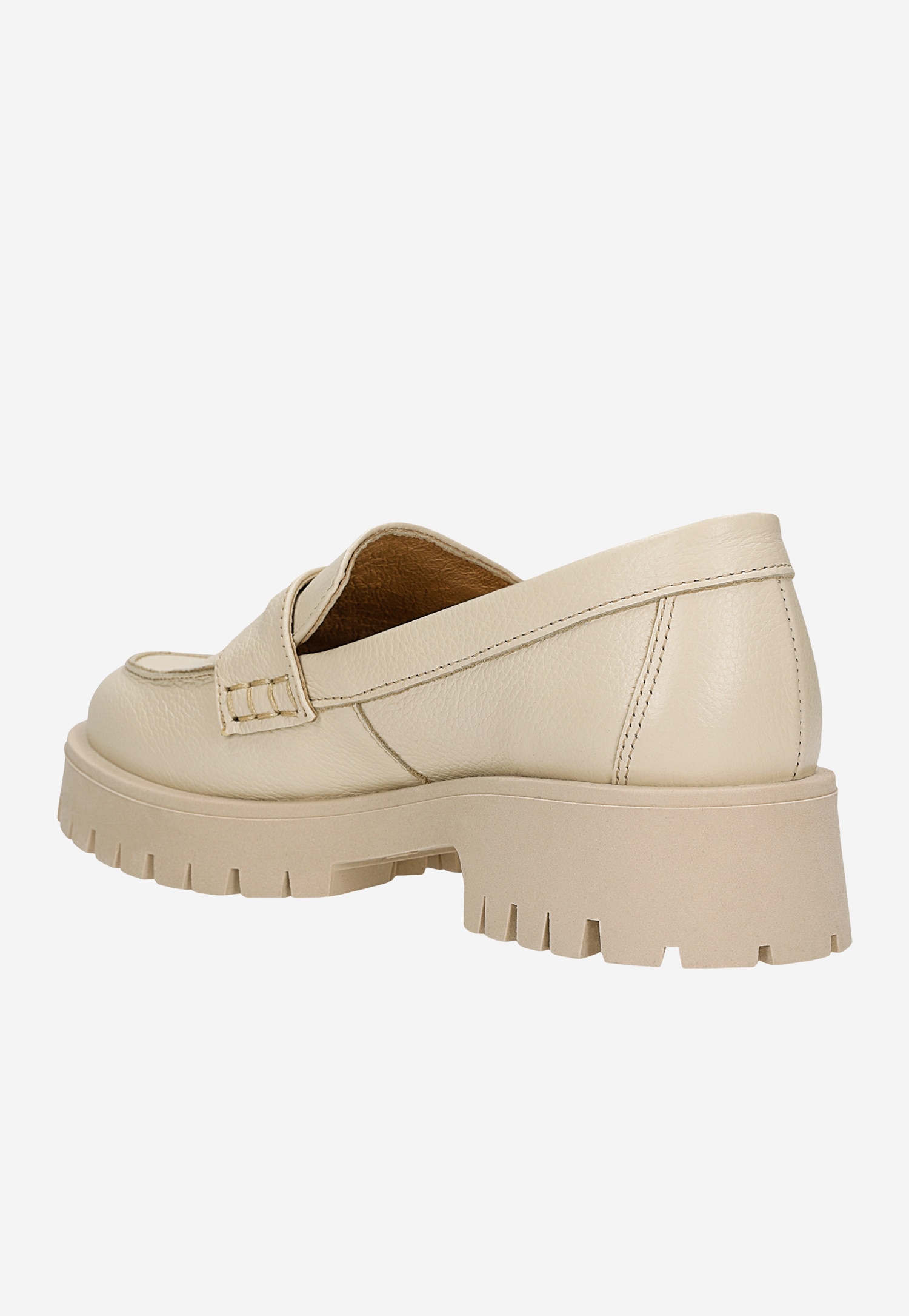 Te beżowe mokasyny ze skóry licowej to połączenie wygody z uniwersalnym stylem casual. Wsuwany fason sprawiają, że w mgnieniu oka założysz je rano, spieszą się do pracy, a potem bez trudu przejdziesz w nich cały dzień. Szeroki obcas o wysokości 4 cm zapewnia stabilność i komfort podczas chodzenia, eliminując uczucie zmęczenia stóp.