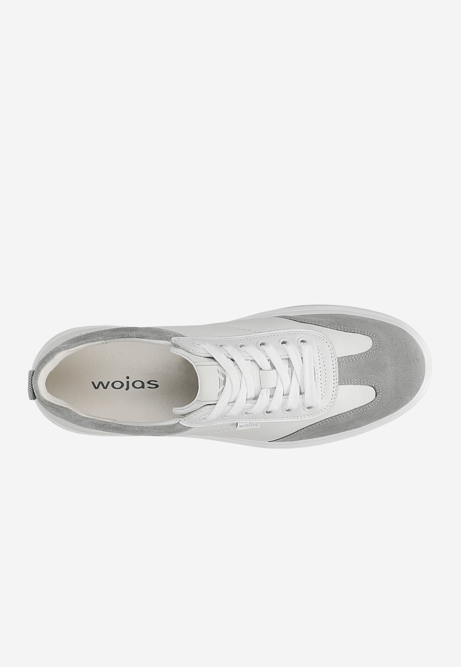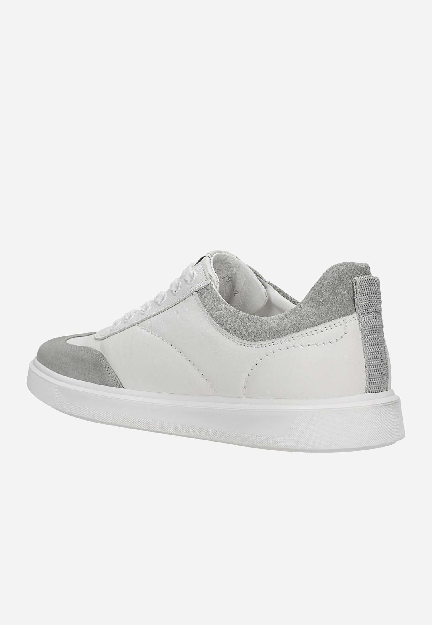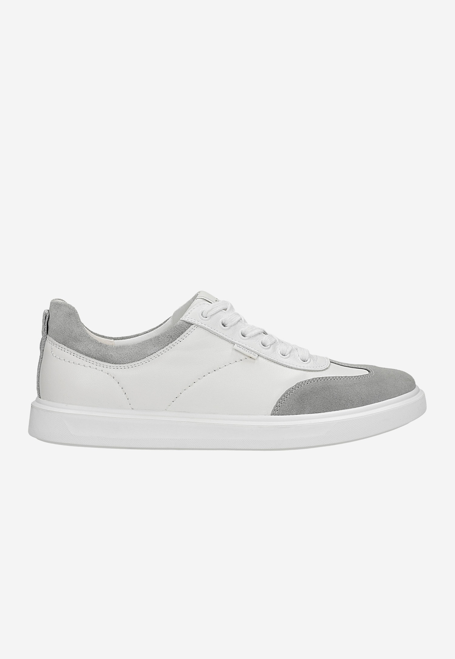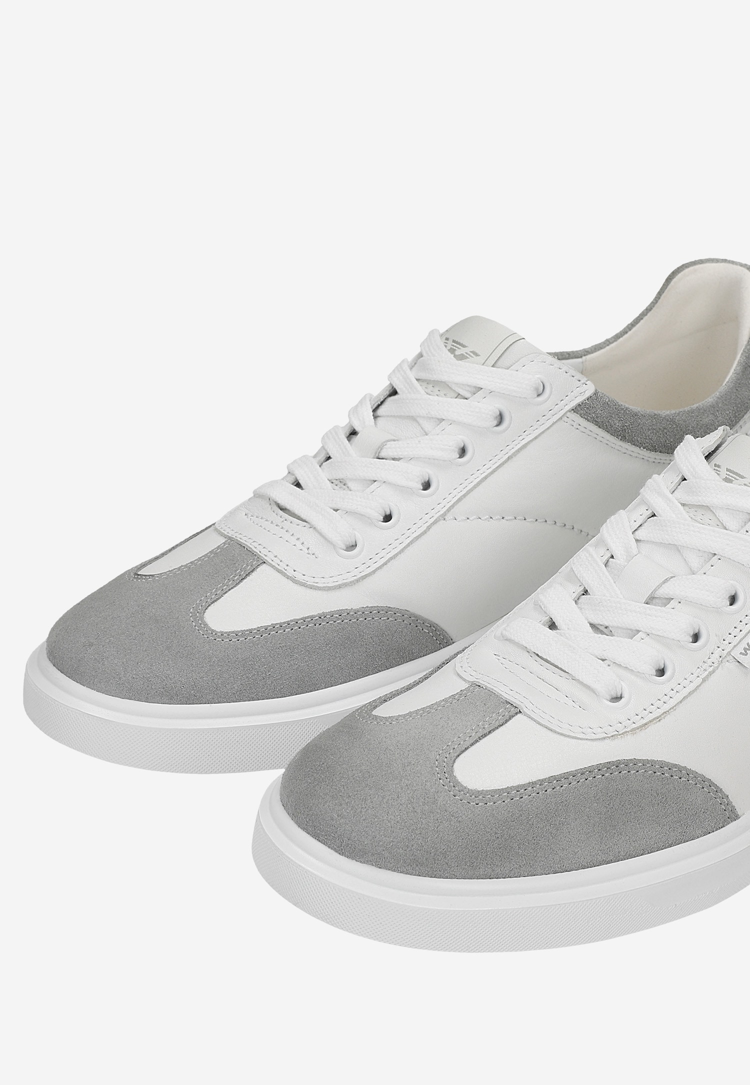 Te sznurowane trampki łączą ponadczasowy biały kolor z szarymi akcentami, tworząc harmonijną kompozycję idealną do casualowych stylizacji. Wykonane ze skóry licowej z delikatnym welurowym wykończeniem, zapewniają trwałość i wygodę przez cały rok.