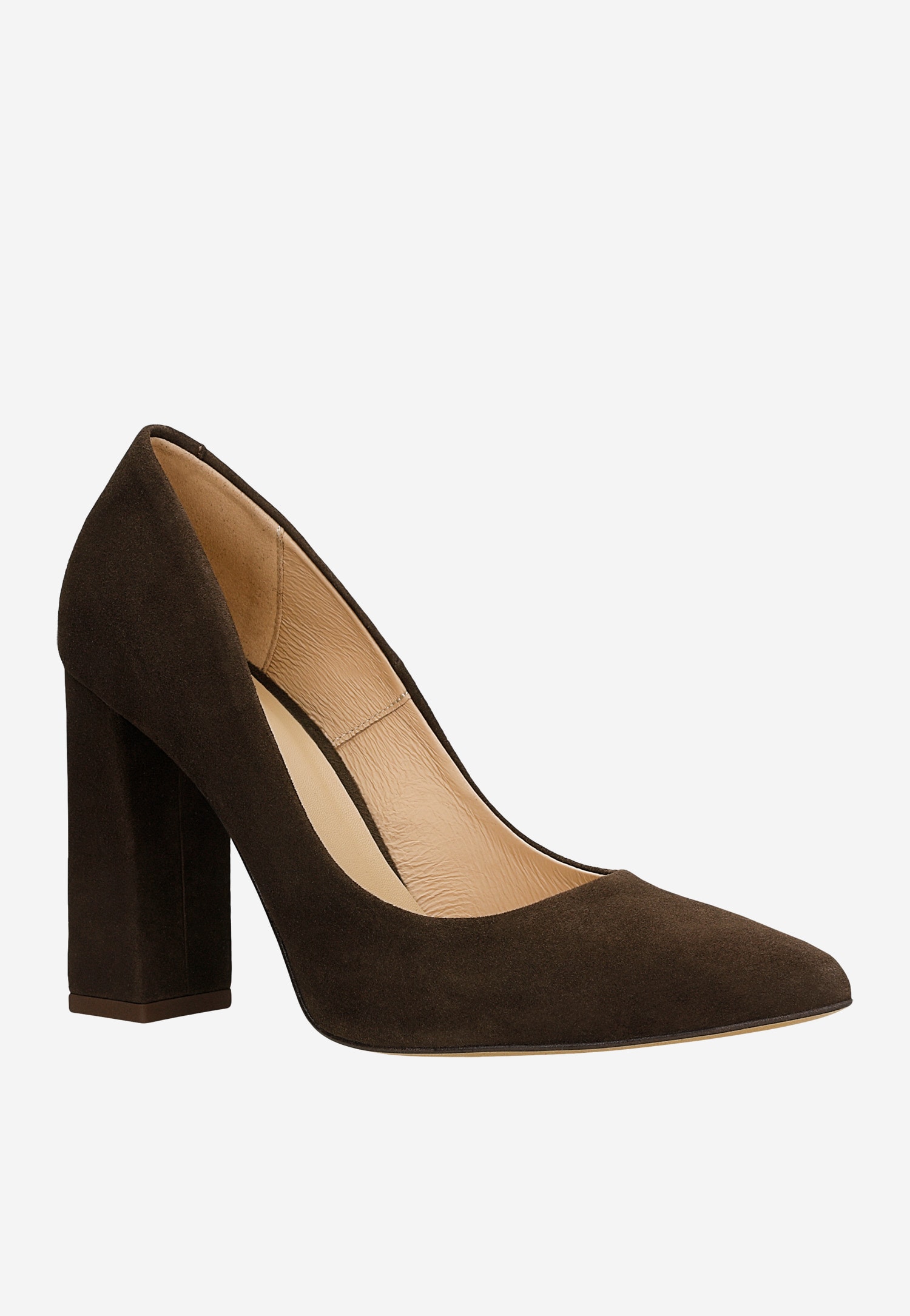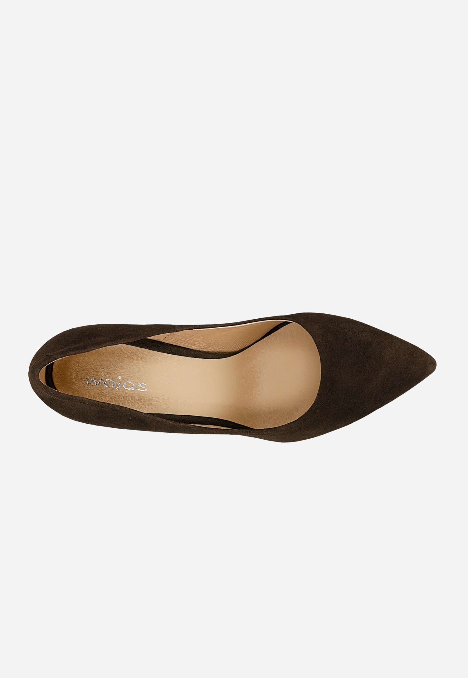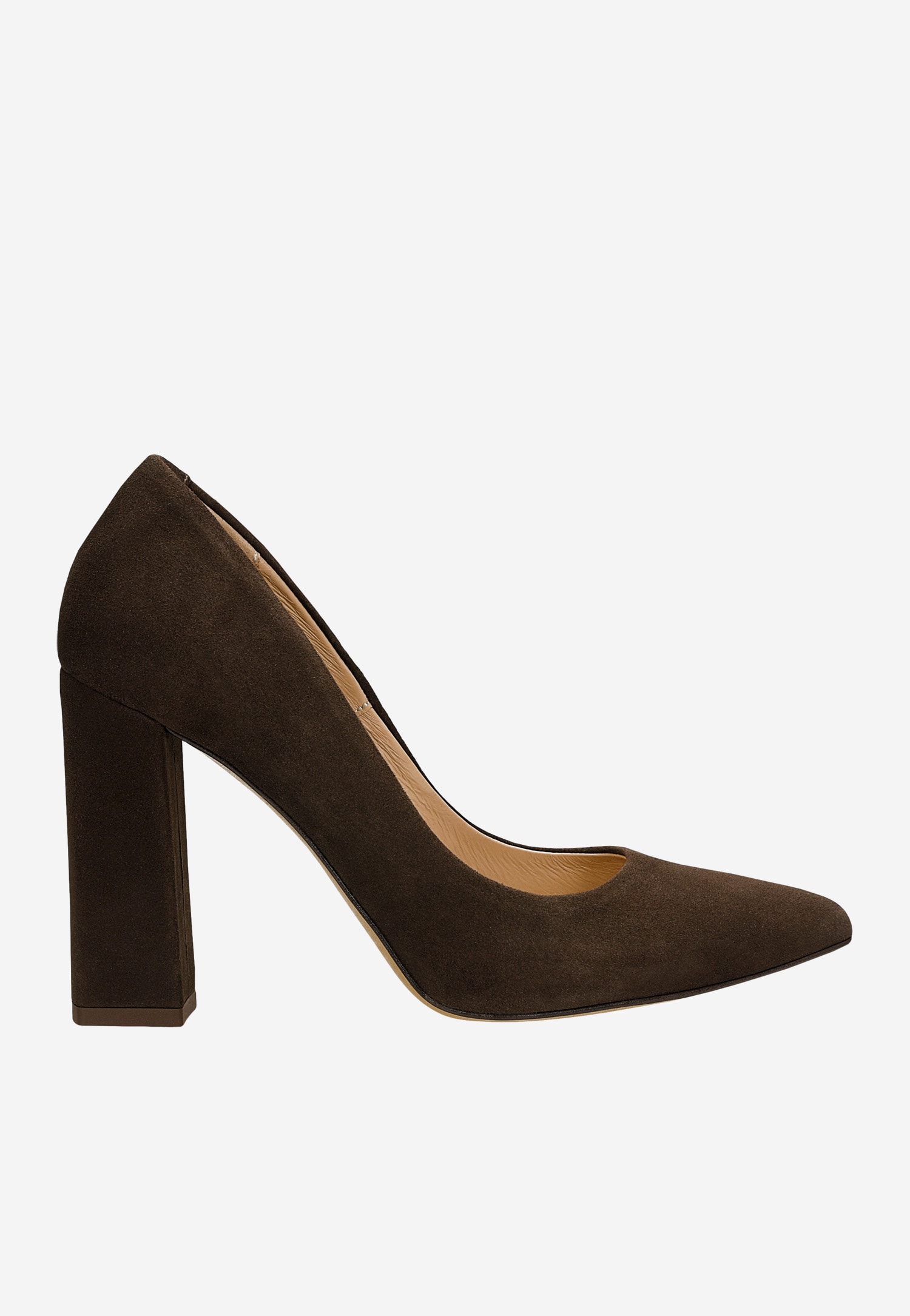 · brązowe wsuwane czółenka damskie wykonano ze skóry welurowej,