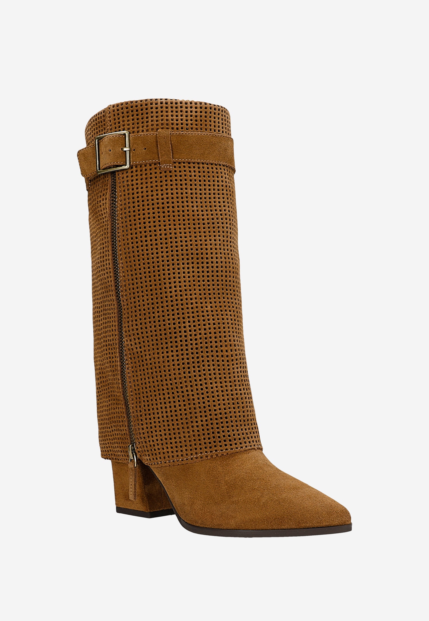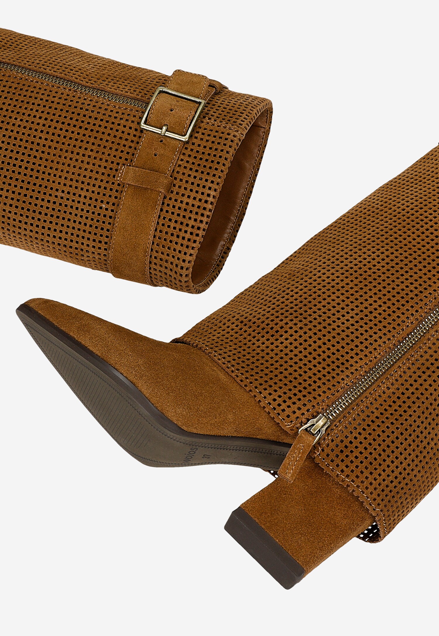 Te brązowe kozaki z ażurową cholewką to połączenie kobiecego designu z miejskim charakterem. Wykonane z miękkiej dwoiny welurowej, zapewniają komfort przez cały dzień, a dekoracyjne wycięcia w cholewce nadają im lekkości i oryginalnego stylu. Całoroczna konstrukcja sprawia, że buty sprawdzą się zarówno w chłodniejsze dni jesieni, jak i cieplejsze miesiące wiosny.