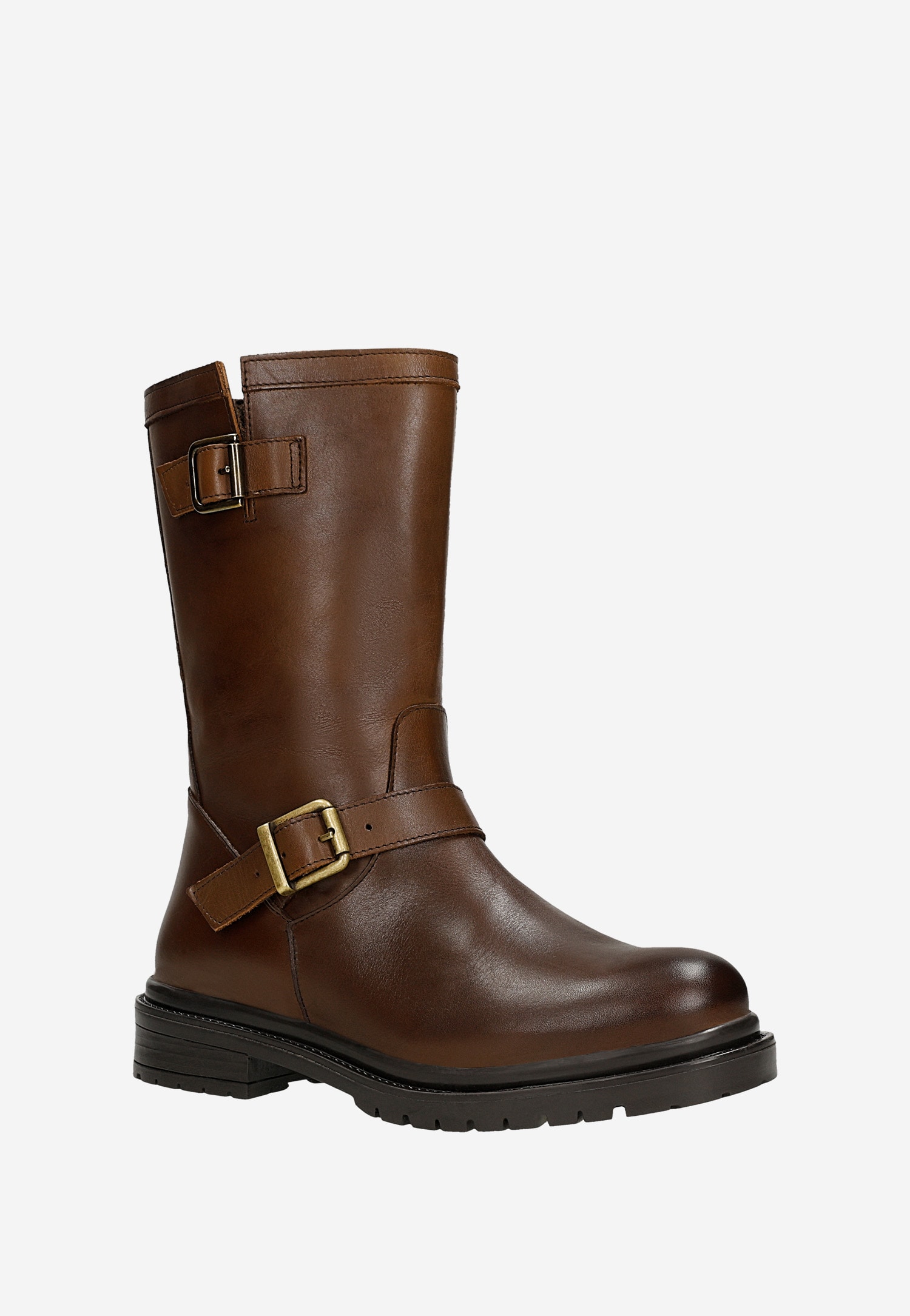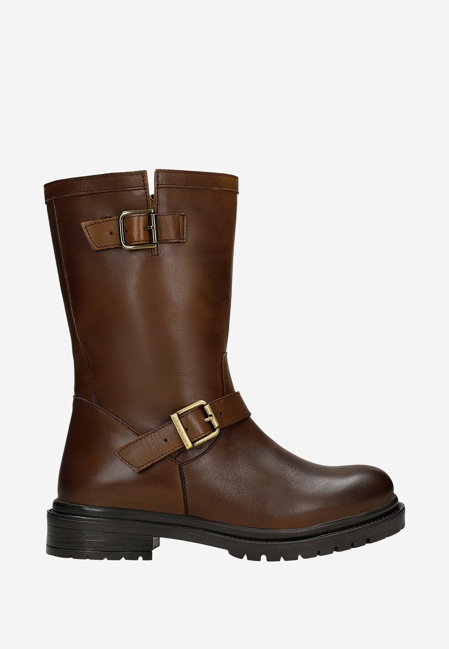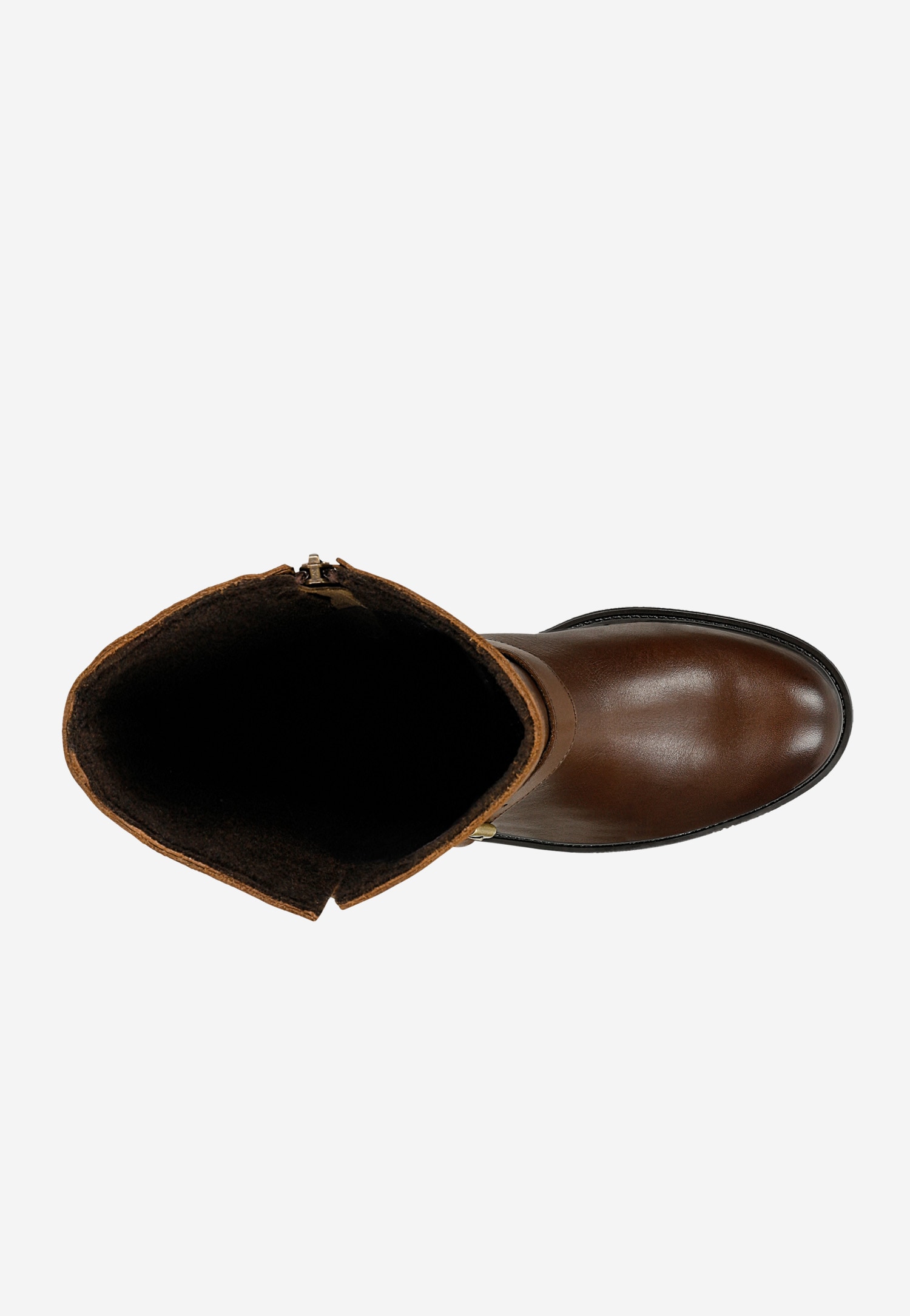 Brązowe ocieplane bikery damskie ze złotymi klamrami 55312-52 Czarne skórzane botki typu bikery 55312-51