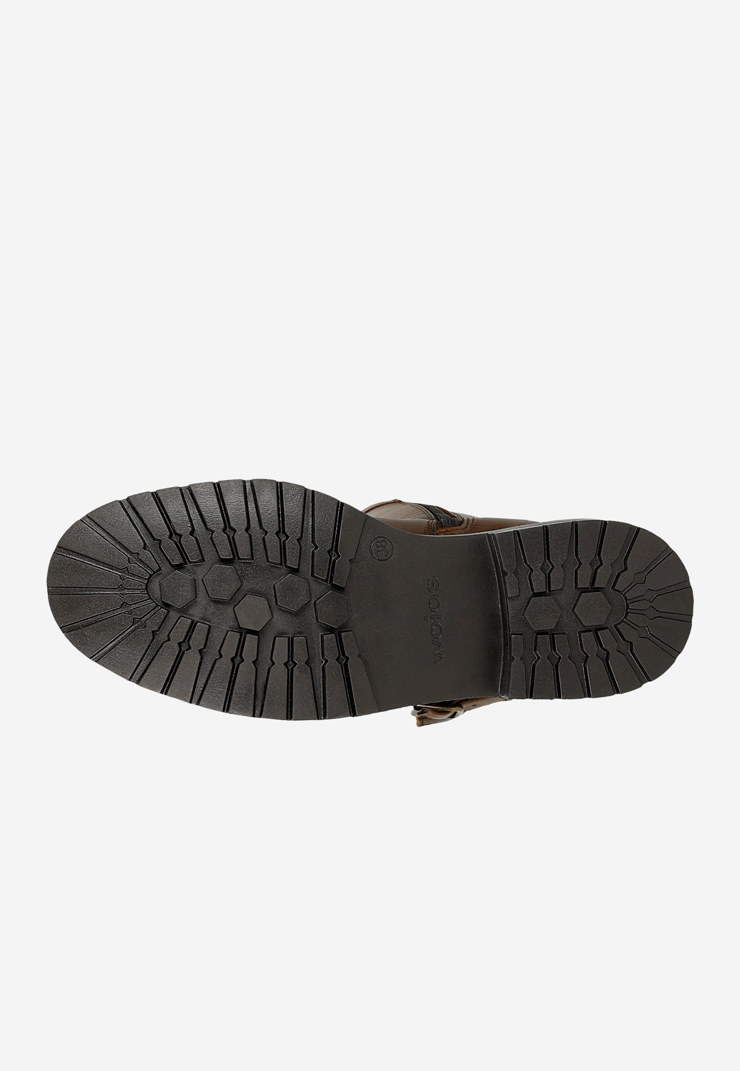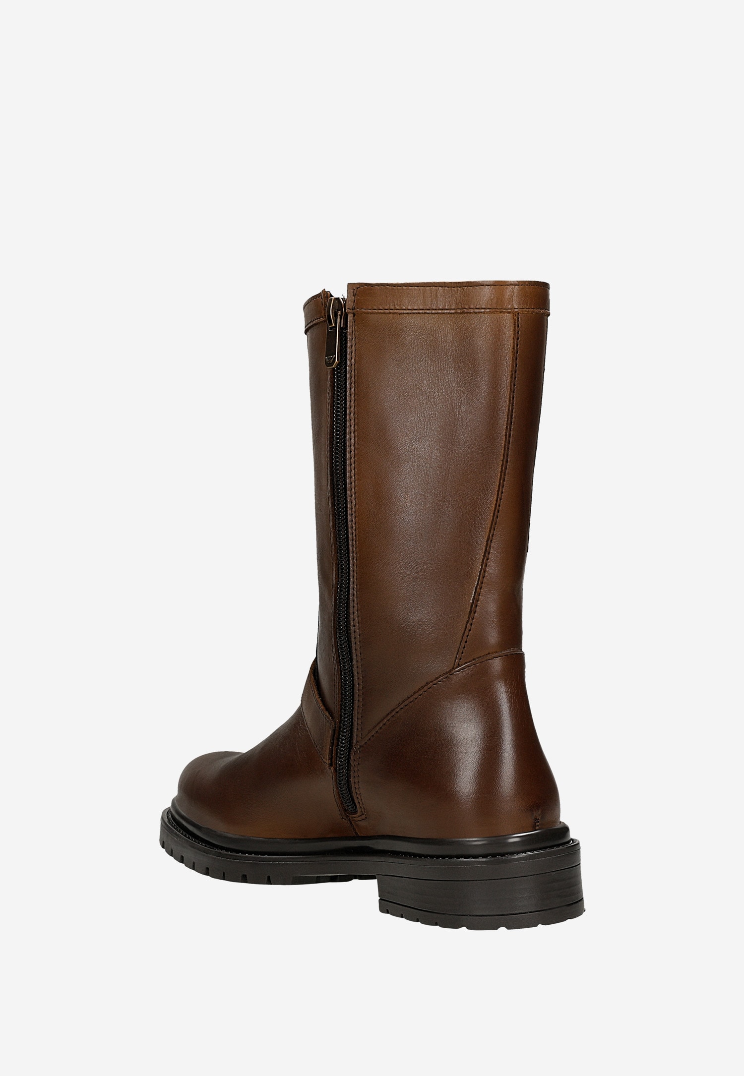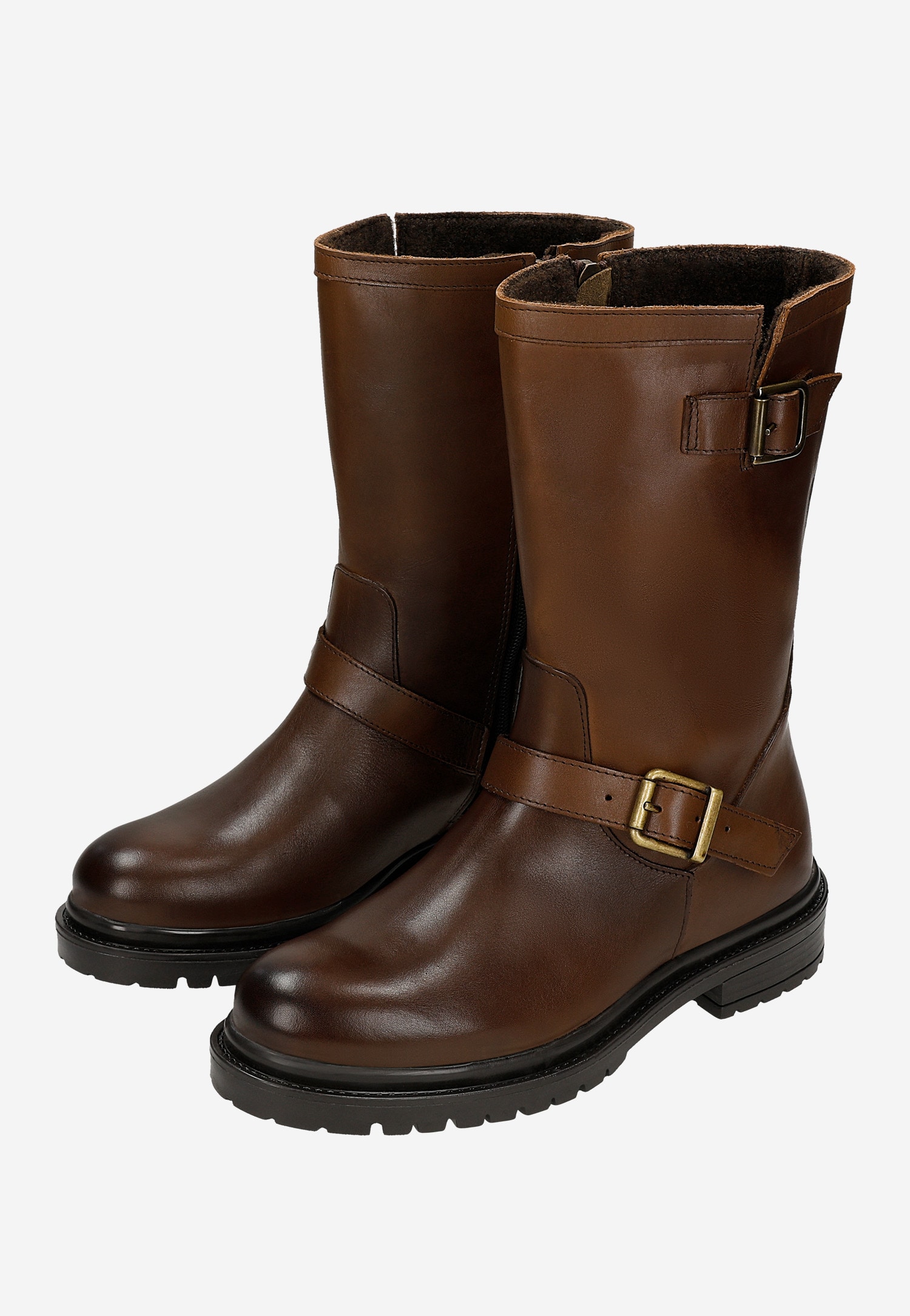 Brązowe ocieplane bikery damskie ze złotymi klamrami 55312-52 Czarne skórzane botki typu bikery 55312-51
