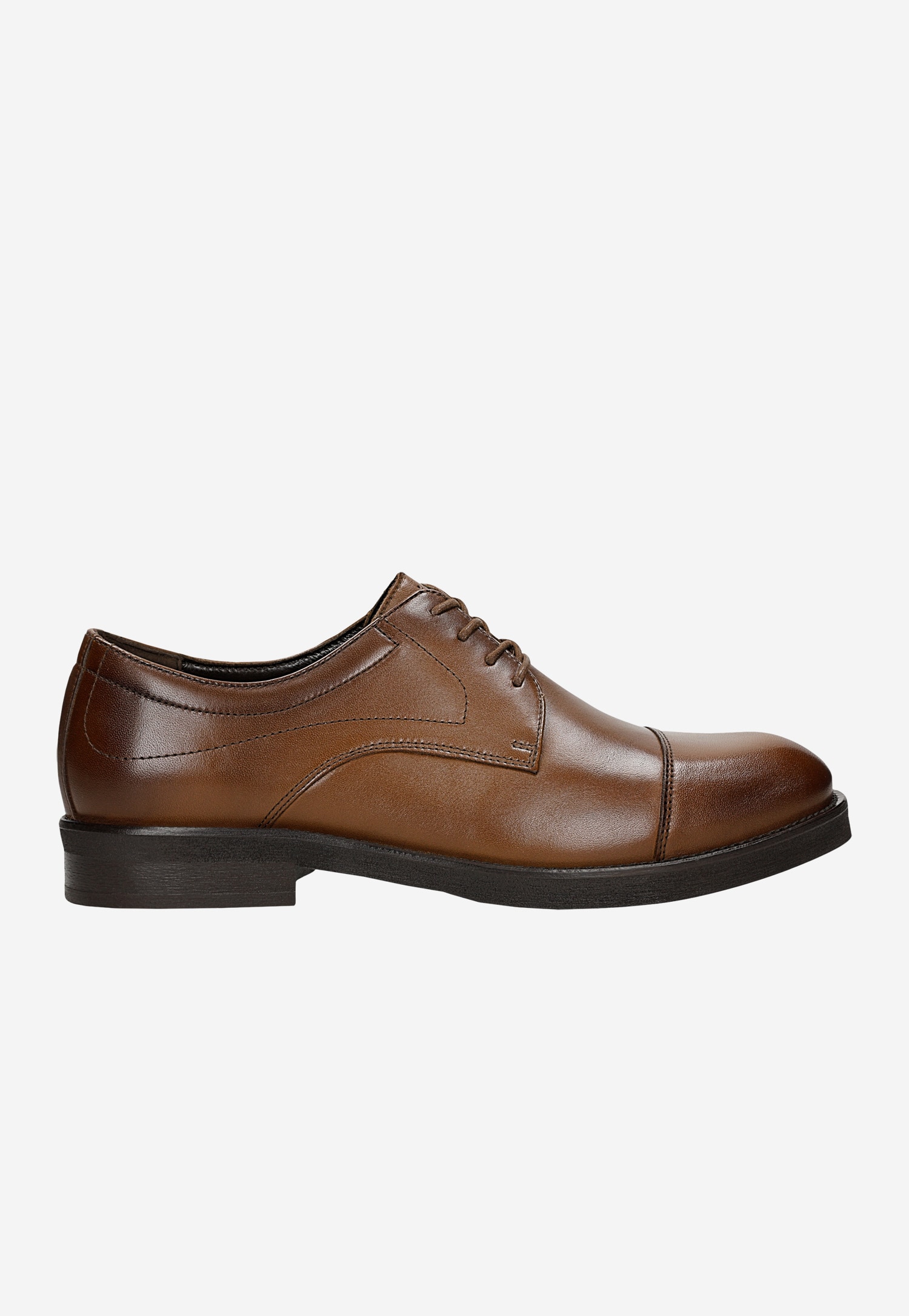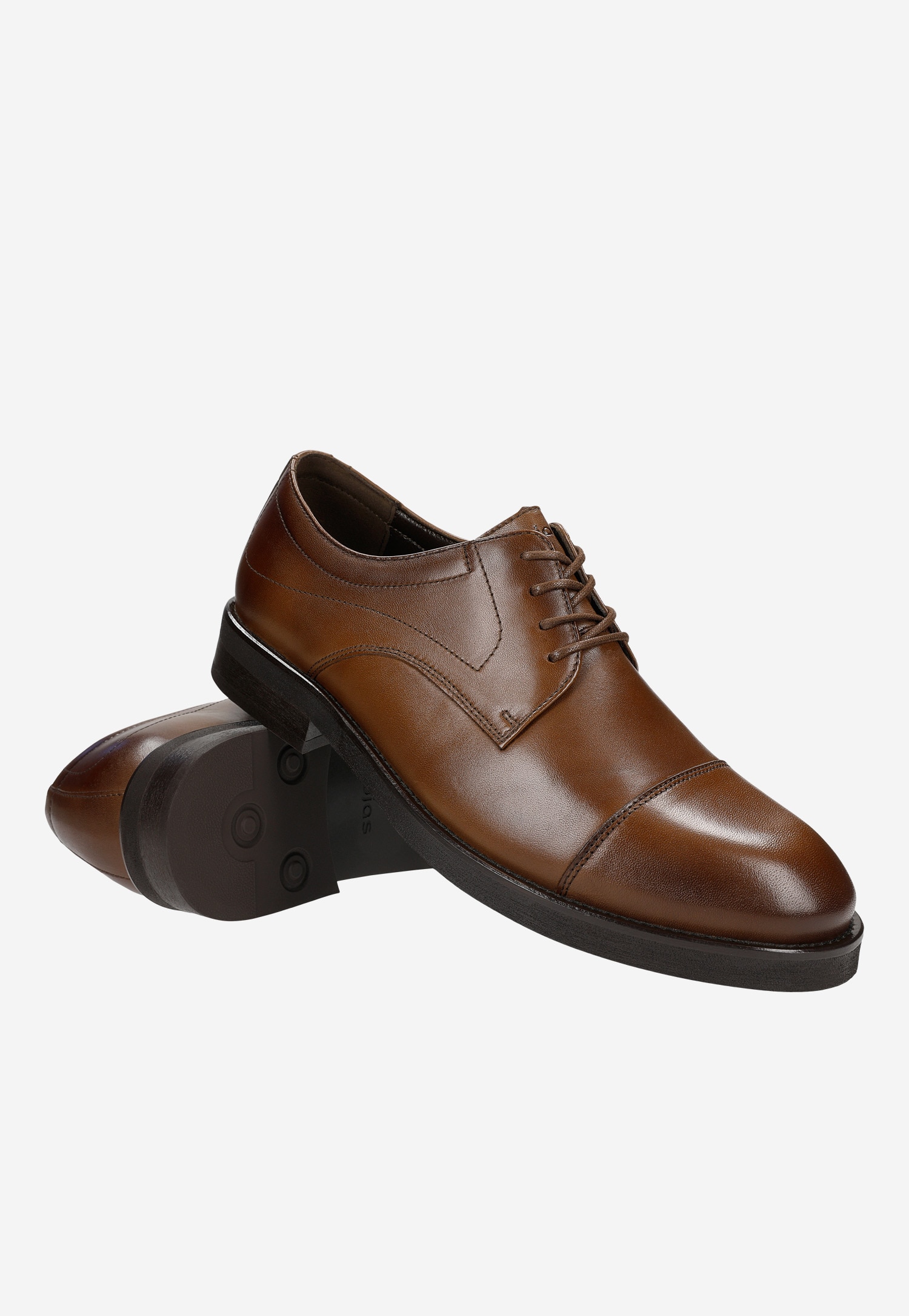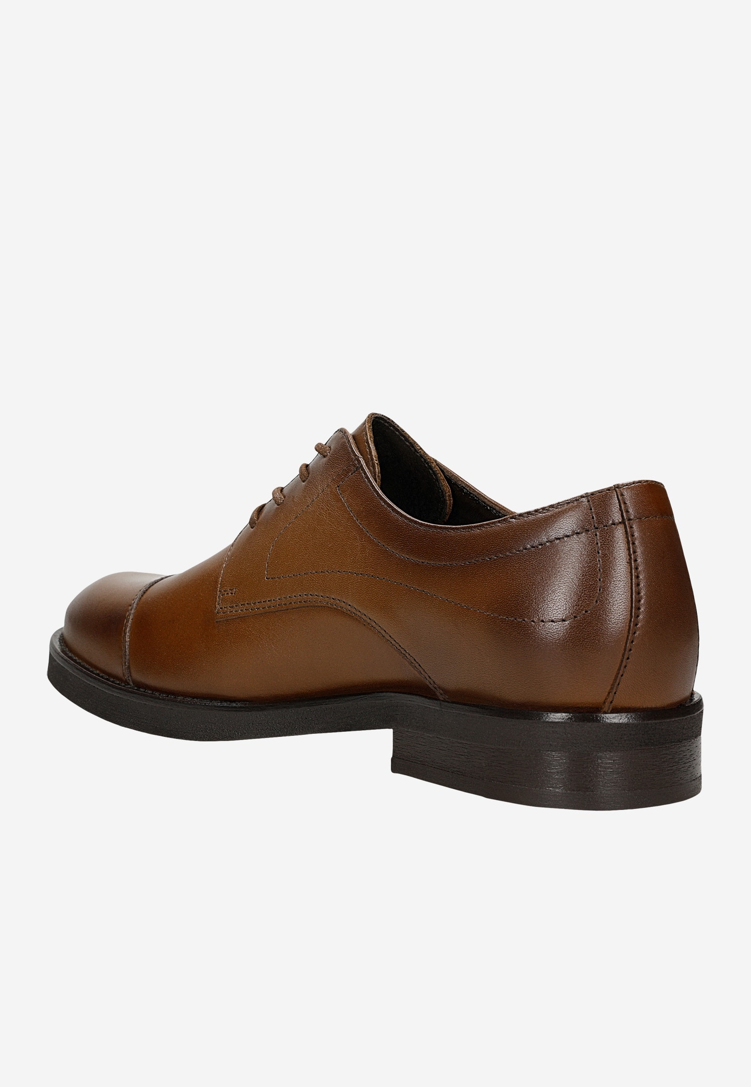 Te brązowe półbuty męskie ze skóry licowej to idealny wybór dla mężczyzn ceniących klasyczny styl z nutą nowoczesności. Sznurowanie pozwala na precyzyjne dopasowanie do stopy, zapewniając komfort przez cały dzień. Uniwersalna brązowa kolorystyka sprawia, że buty doskonale komponują się zarówno z jeansami, jak i eleganckimi chinosami – perfekcyjne rozwiązanie do pracy i na miejskie spotkania.