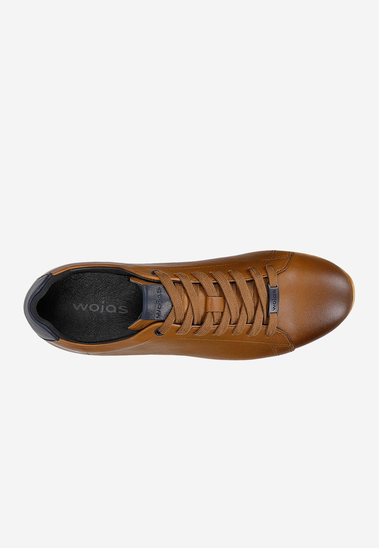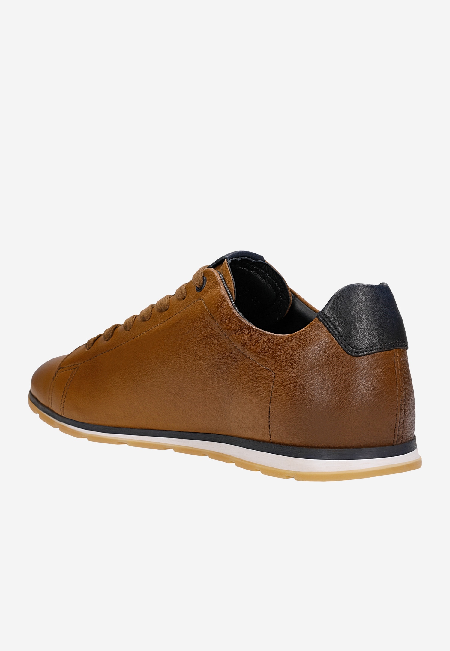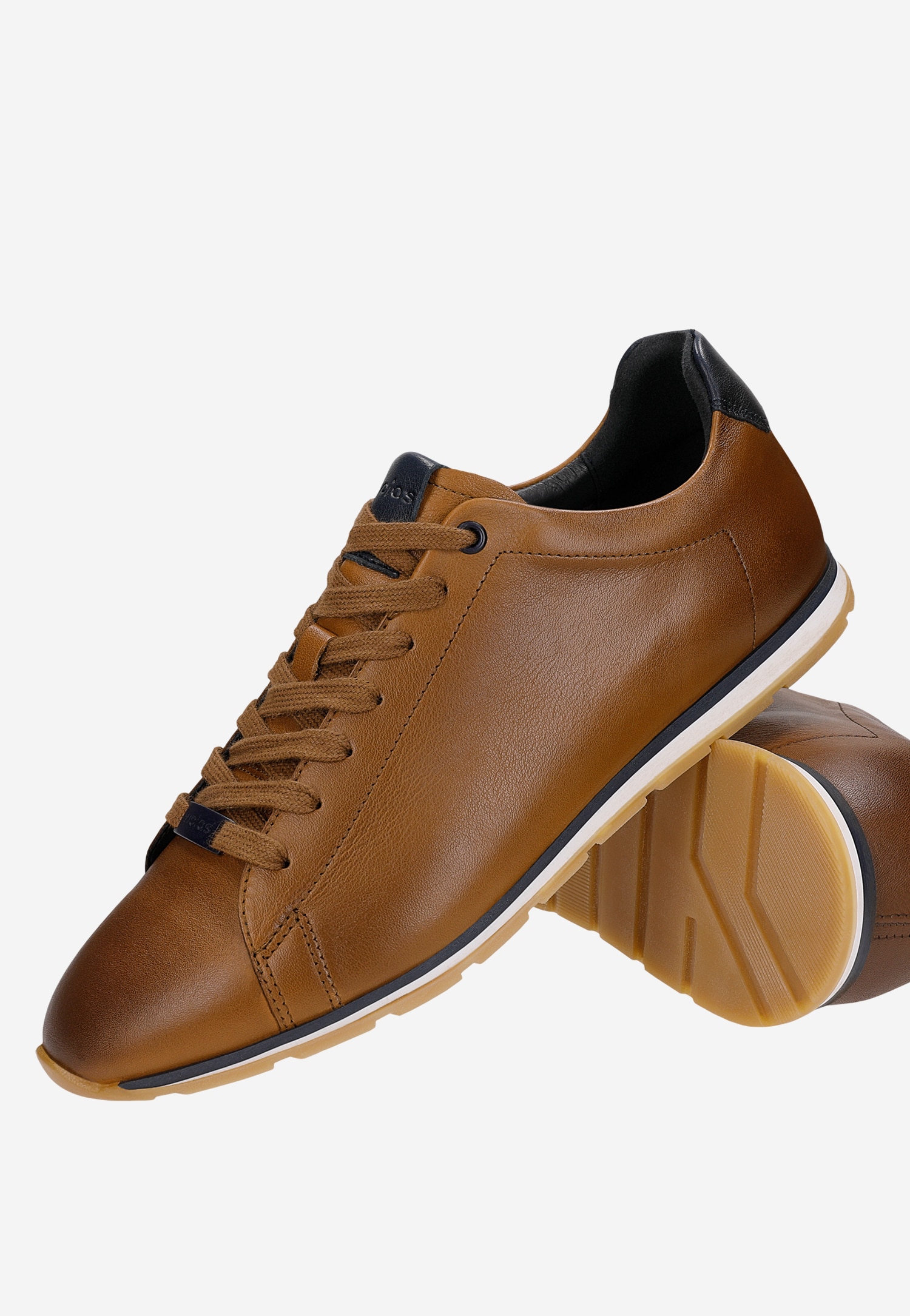 Te sznurowane sneakersy łączą sportową wygodę z miejską elegancją. Wykonane ze skóry licowej w ciepłym brązowym kolorze, ozdobione granatową wstawką, która nadaje im nowoczesnego charakteru. To obuwie stworzone dla mężczyzn ceniących komfort i uniwersalny styl.