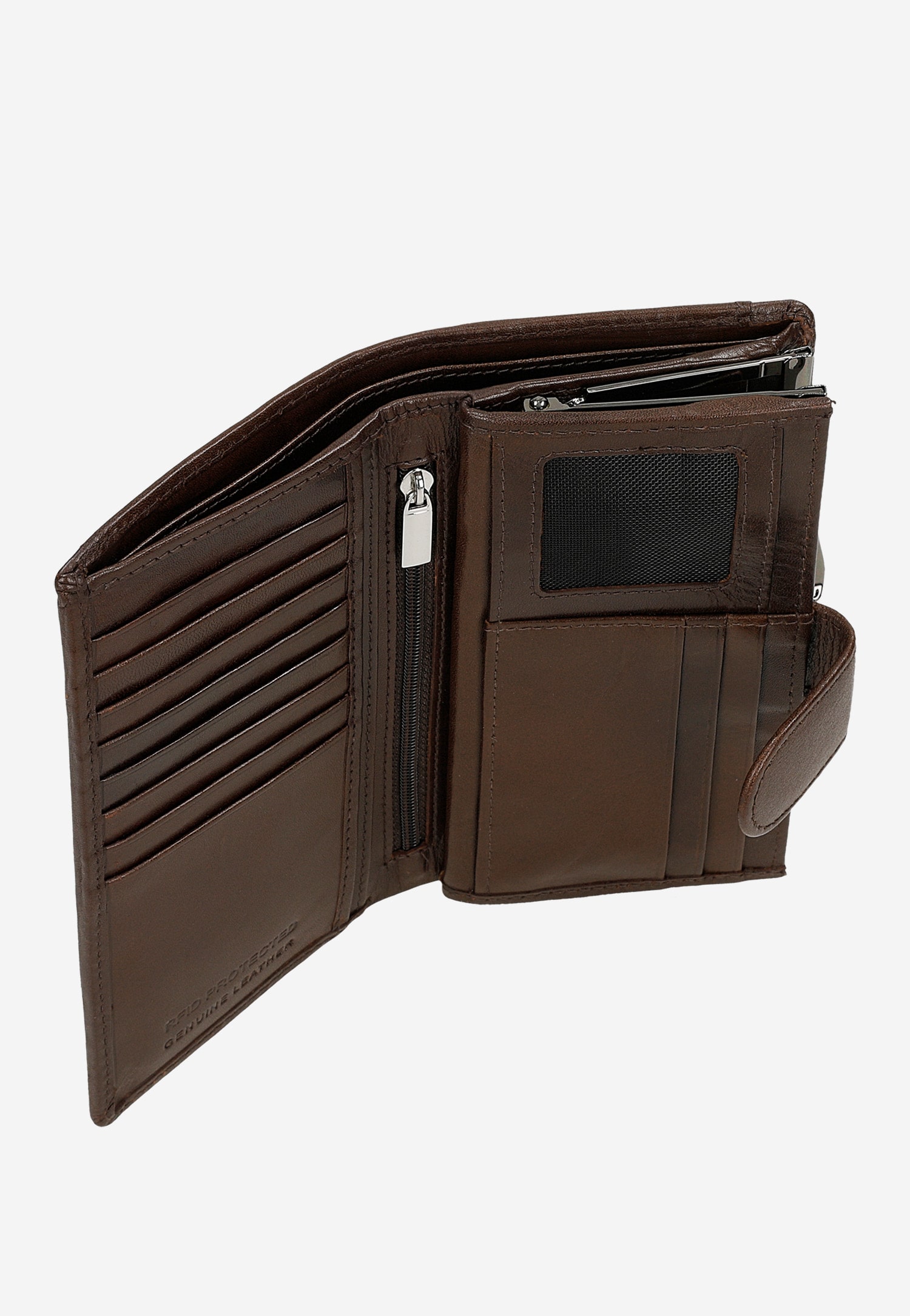Ten klasyczny portfel ze skóry licowej w ciepłym brązowym kolorze to połączenie ponadczasowego designu z nowoczesną funkcjonalnością. Praktyczny zatrzask gwarantuje bezpieczne przechowywanie zawartości, a wbudowana technologia RFID chroni Twoje karty przed nieautoryzowanym skanowaniem – kluczowa funkcja w dzisiejszych czasach rosnącego zagrożenia cybernetycznego.