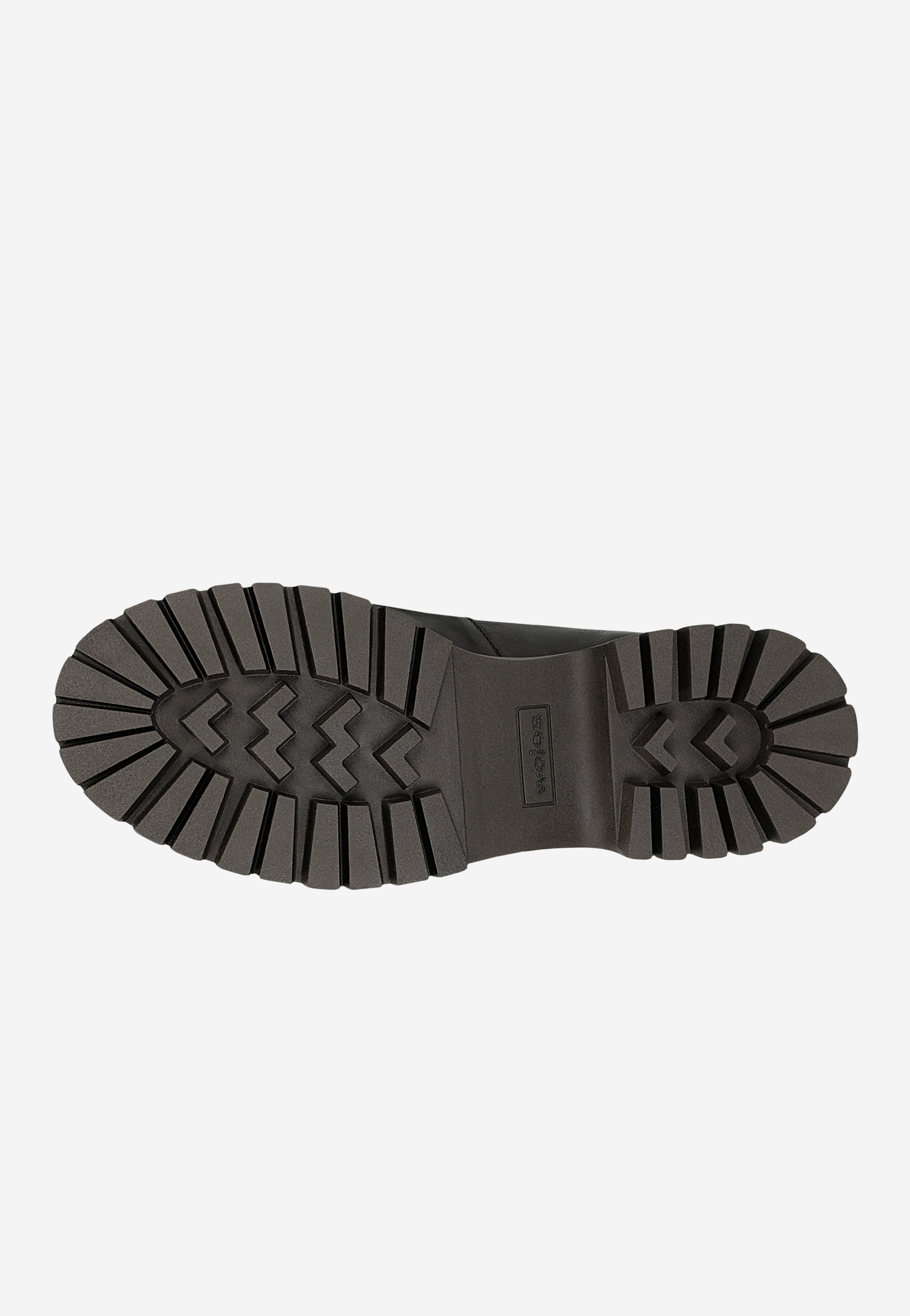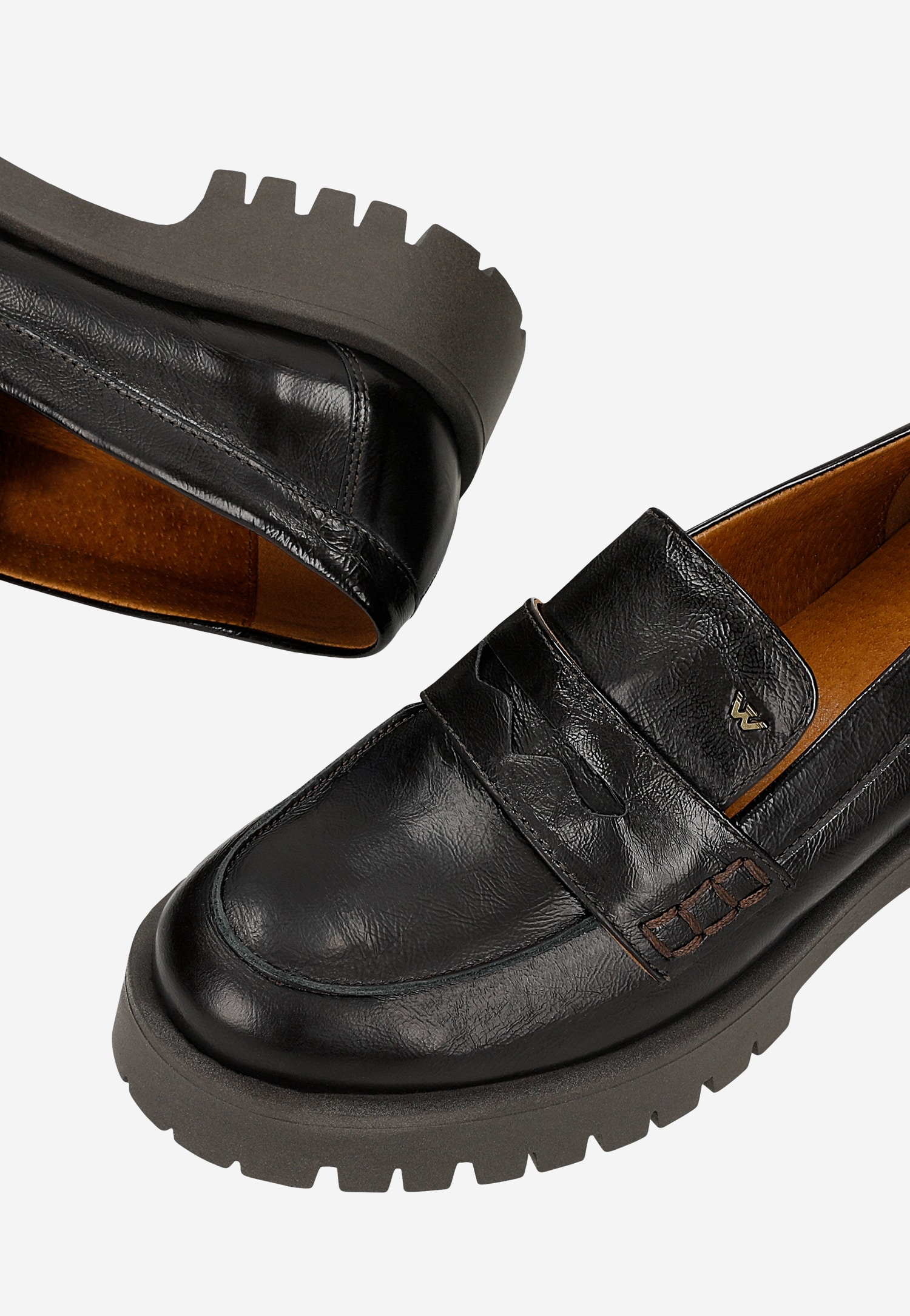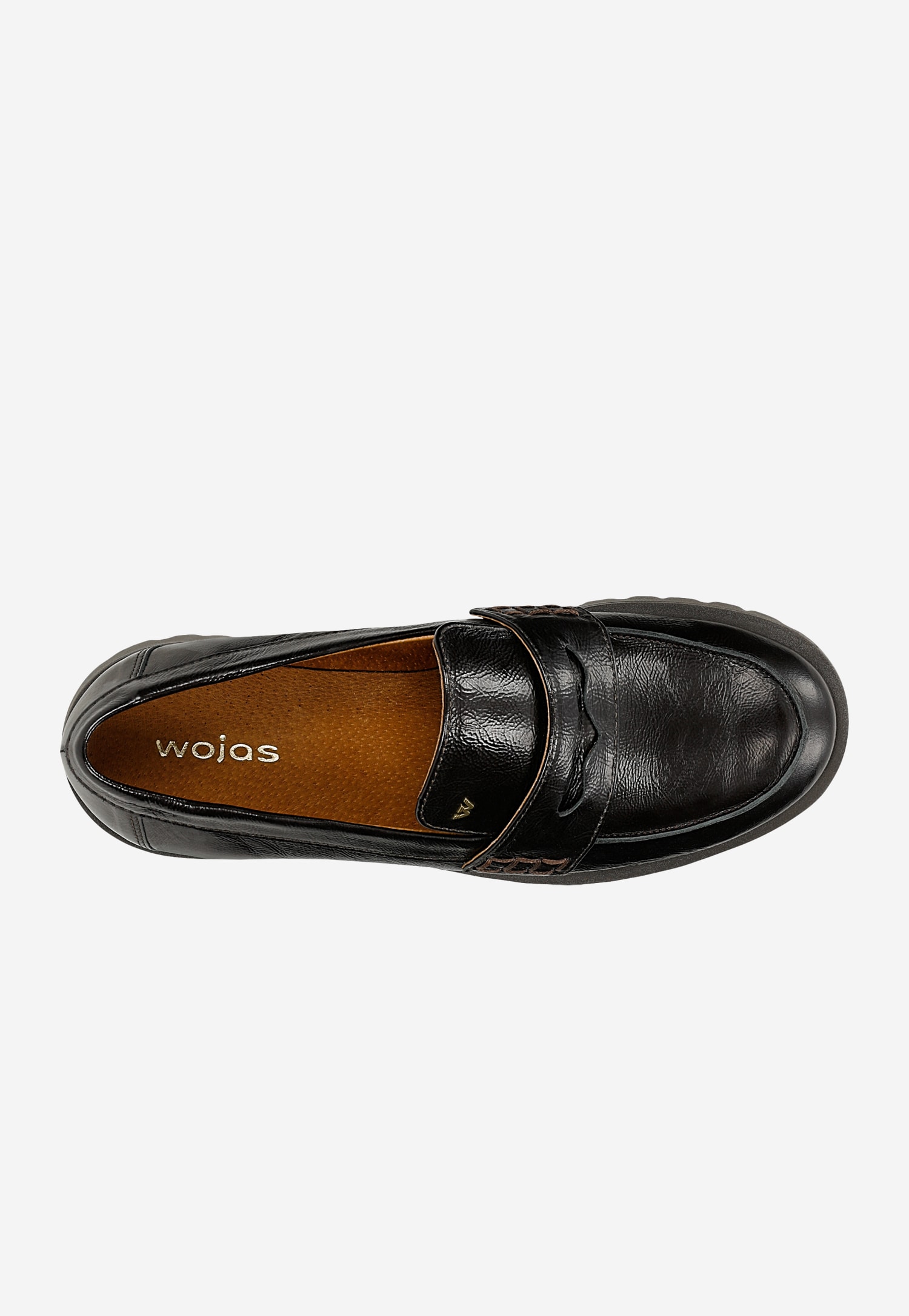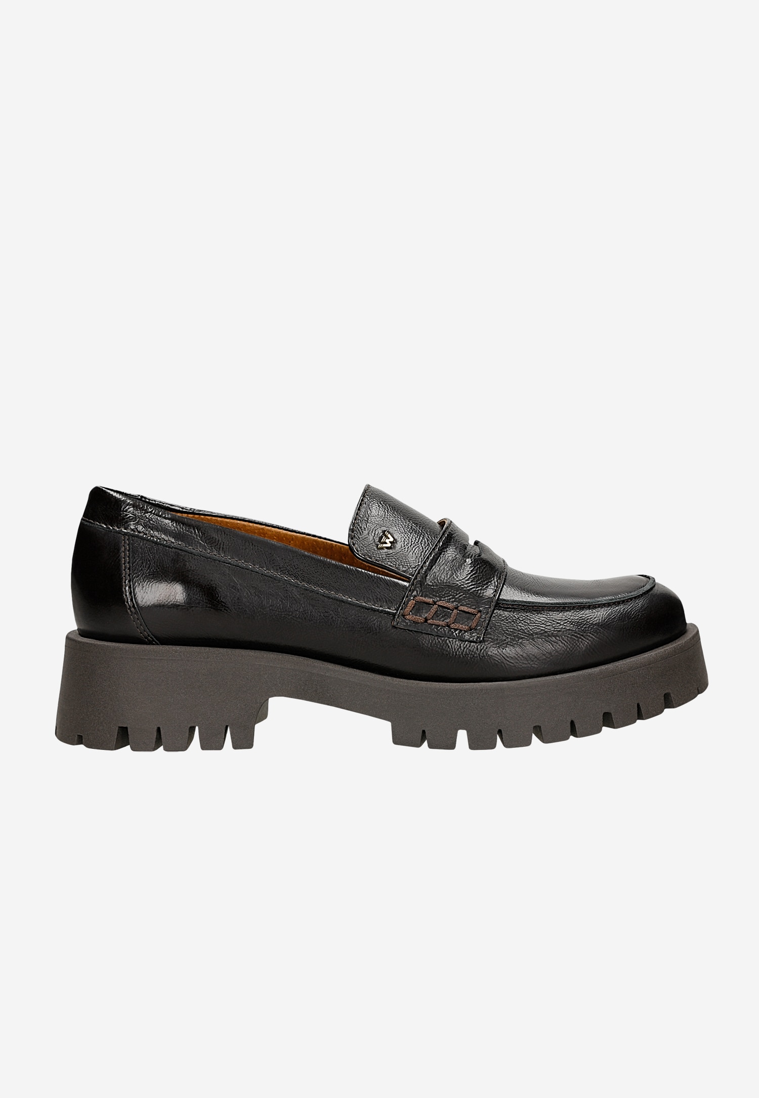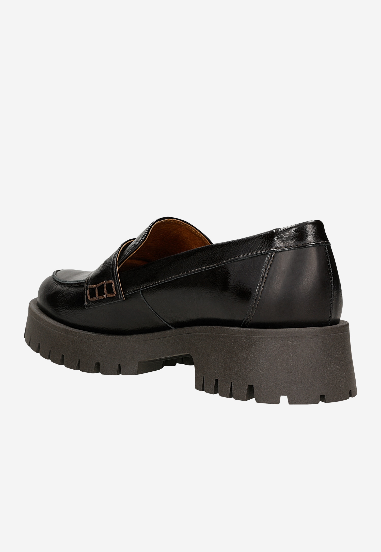 Te lakierowane mokasyny w głębokim ciemnobrązowym kolorze to idealne połączenie komfortu i stylu casual. Wysoka podeszwa o grubości 2,5 cm oraz szeroki obcas 4 cm zapewniają stabilność i wygodę podczas całodziennego noszenia, a jednocześnie optycznie wydłużają sylwetkę.