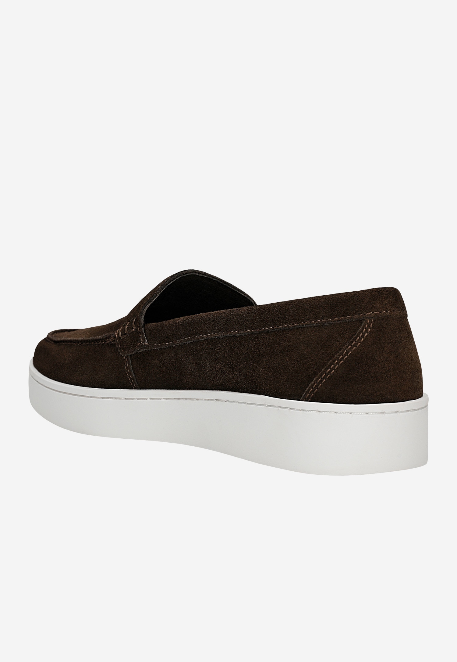 Te wsuwane mokasyny w kolorze ciemnobrązowym to idealne obuwie dla mężczyzn ceniących komfort i swobodny styl. Wykonane z miękkiej dwoiny welurowej, zapewniają przyjemność noszenia przez cały dzień. Kontrastowa biała podeszwa nadaje im nowoczesnego charakteru, wyróżniając je spośród klasycznych modeli.