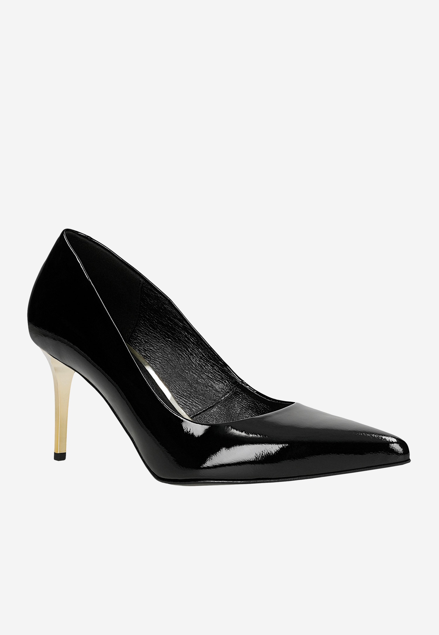 Te lakierowane czółenka w klasycznej czerni to idealne połączenie kobiecości i wyrafinowanego stylu. Złoty obcas typu szpilka o wysokości 7,5 cm nadaje charakteru każdej formalnej stylizacji, przyciągając uwagę subtelnym blaskiem. Lakierowana skóra odbija światło, tworząc elegancki efekt, który podkreśli Twoją pewność siebie podczas ważnych spotkań biznesowych czy wieczornych wyjść.