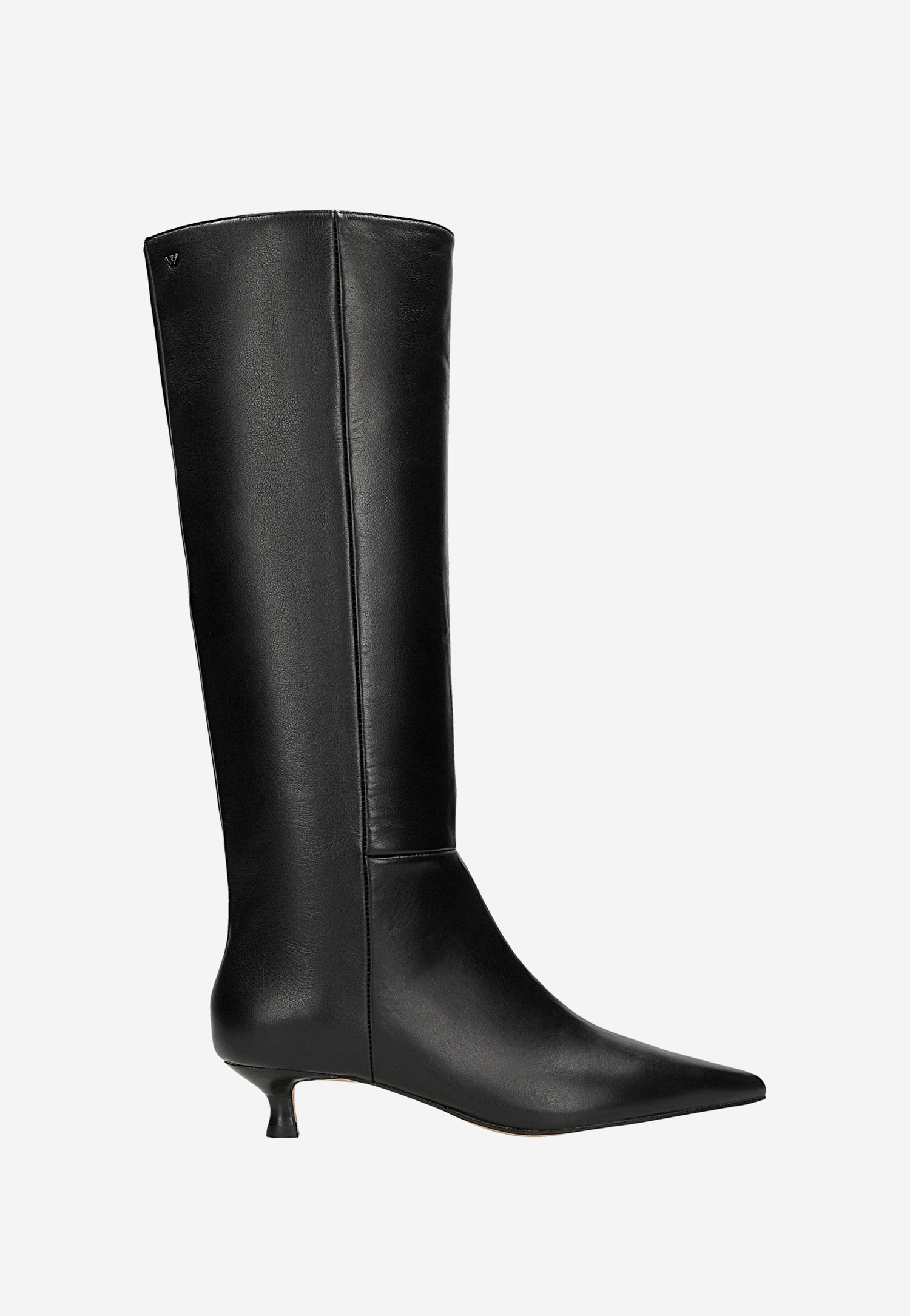 Bordowe kozaki na kaczuszce z noskiem w szpic 71119-55 Brązowe czekoladowe kozaki damskie na niskim obcasie 71119-62 Czarne skórzane kozaki damskie na niskim obcasie 71119-51