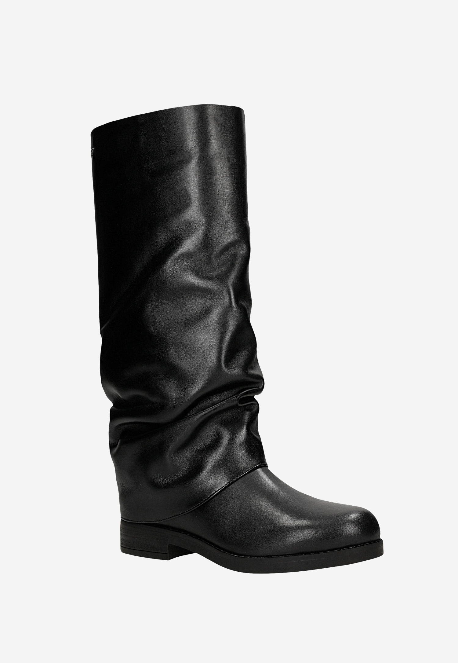 Te jesienne czarne kozaki ze skóry licowej łączą w sobie ponadczasową elegancję z miejskim charakterem. Unikalna marszczona cholewka nadaje całości wyrazistego designu, który wyróżni Cię w tłumie i doda każdej stylizacji artystycznego akcentu.