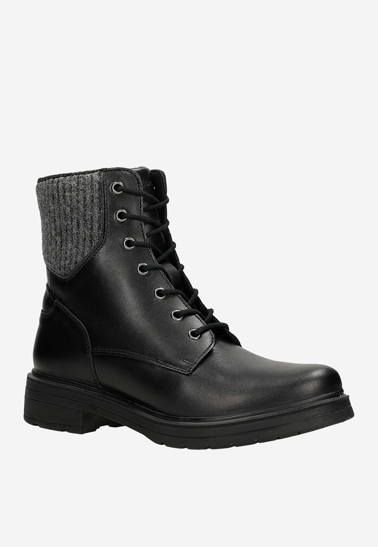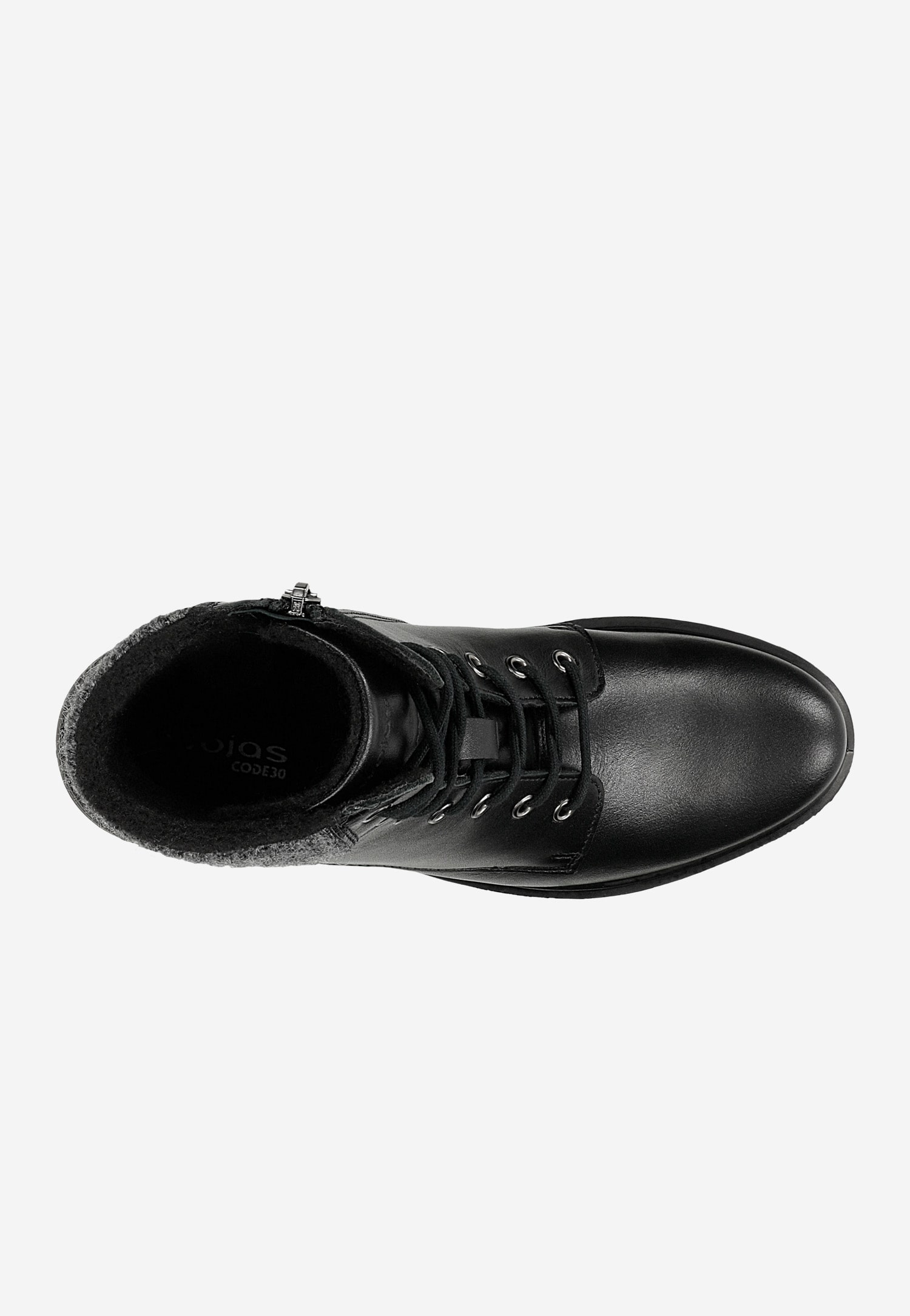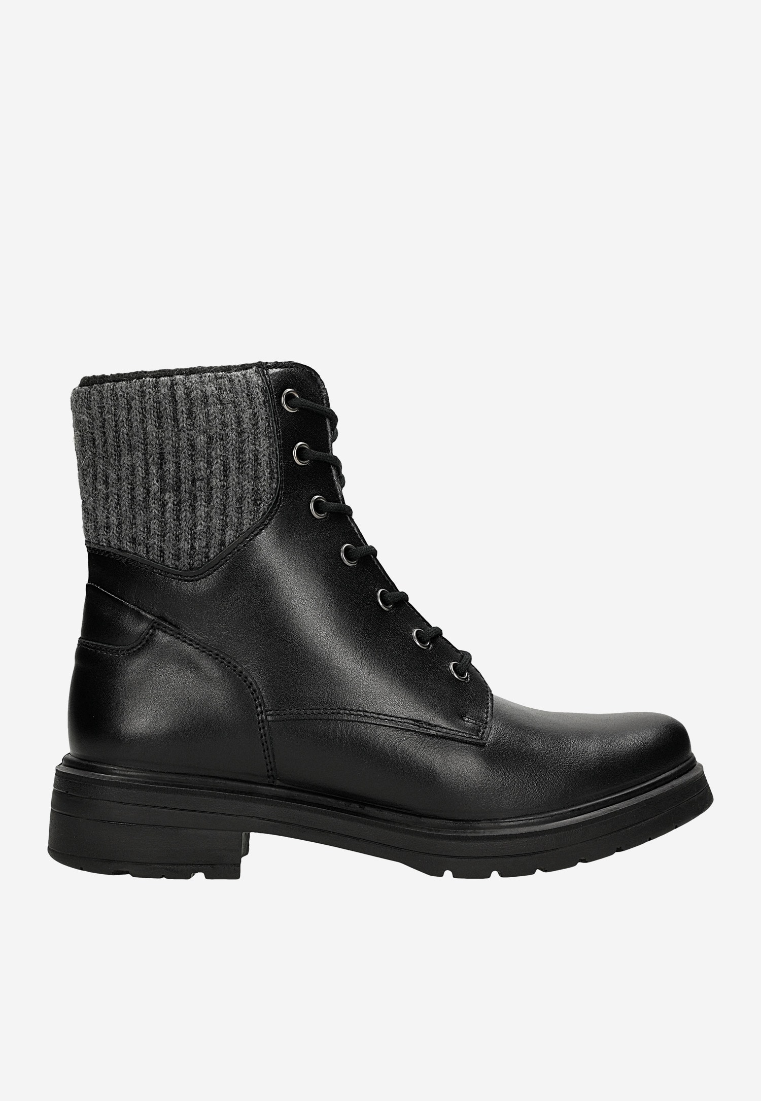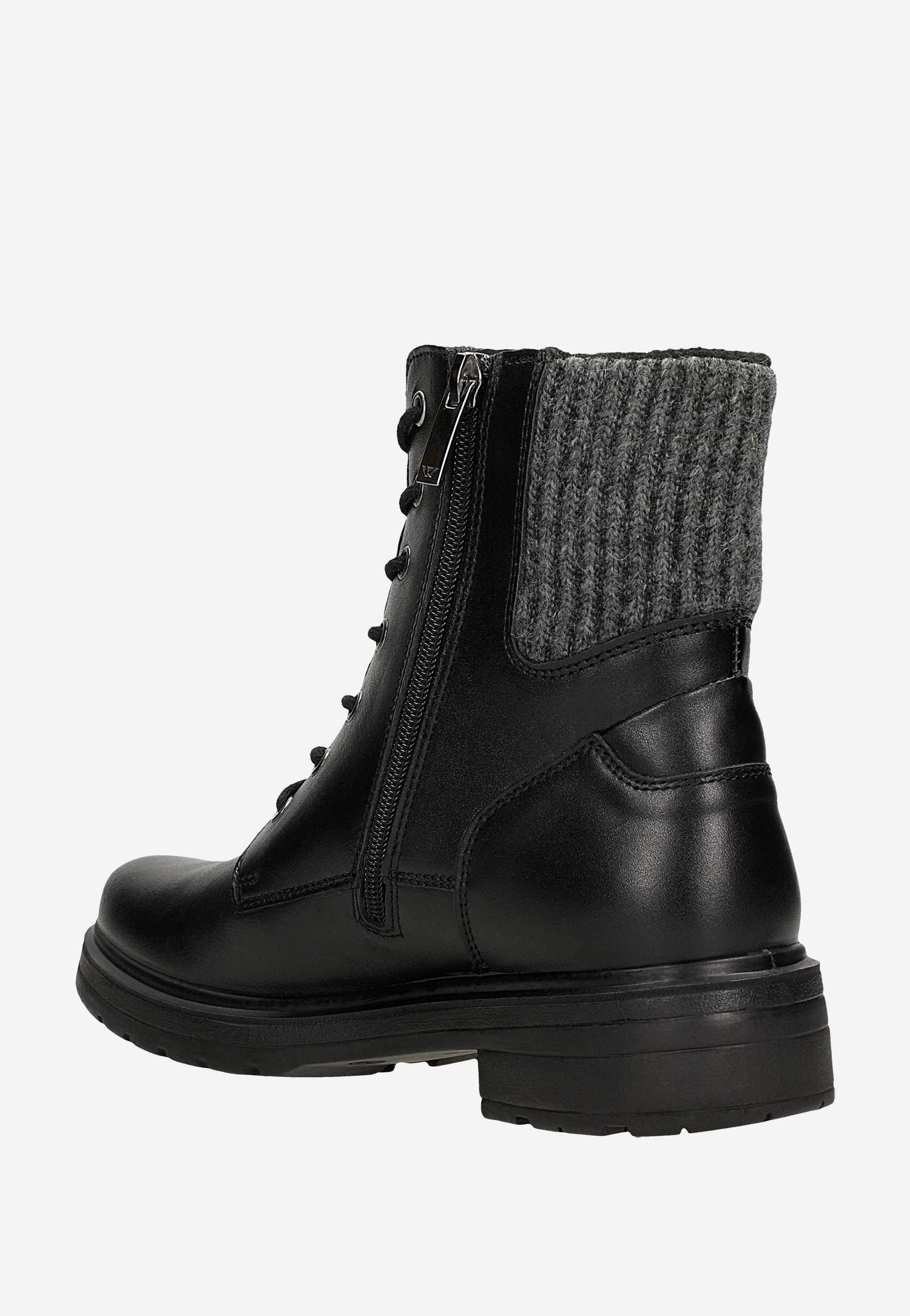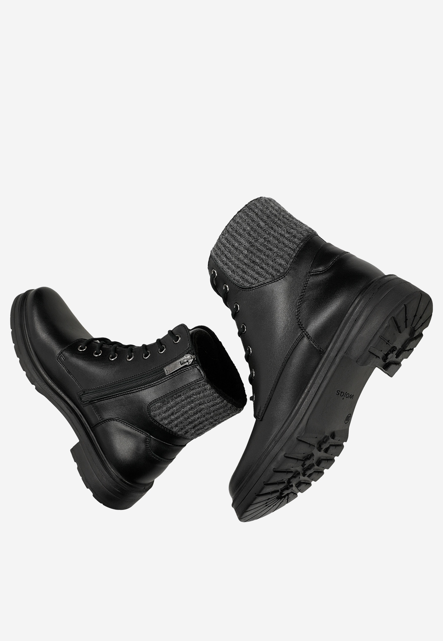 Te czarne botki zimowe Wojas to doskonały wybór na chłodniejsze miesiące. Elegancka kombinacja gładkiej skóry licowej z dzianinową wstawką tworzy nowoczesny design, który z łatwością dopasujesz do wielu stylizacji – od casualowych jeansów po eleganckie płaszcze.