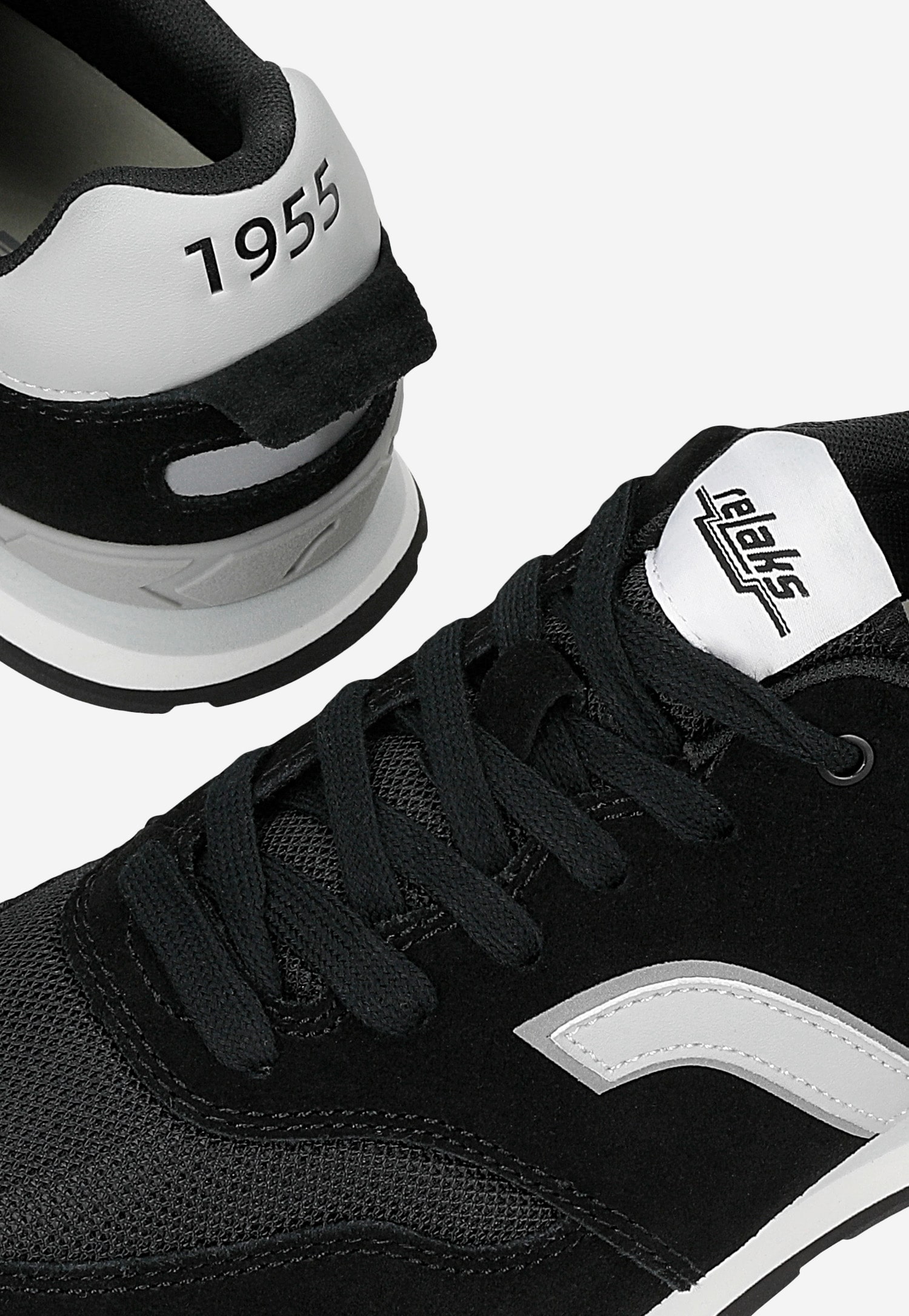 Sportowe sneakersy RELAKS to nowoczesna propozycja dla miłośniczek i miłośników wygody i stylu. Wykonane z dwoiny welurowej oraz oddychającego materiału tekstylnego, łączą funkcjonalność z estetyką. Dominującym kolorem jest czerń, przełamana popielatymi i białymi akcentami, które nadają butom dynamicznego wyglądu. Model ma klasyczne sznurowanie oraz zaokrąglony nosek, zapewniający komfort podczas codziennego użytkowania. Na języku, na białym tle, umieszczono ciemne logo. Na cholewce znajdują się popielato-białe dekoracyjne naszywki, a tył zdobi biała wstawka z datą 1955, jest to rok produkcji pierwszych par marki Relaks. Podeszwa w odcieniach czerni, bieli i szarości wykonana jest z lekkiej pianki EVA oraz gumy, co zapewnia elastyczność, przyczepność i wygodę każdego dnia.