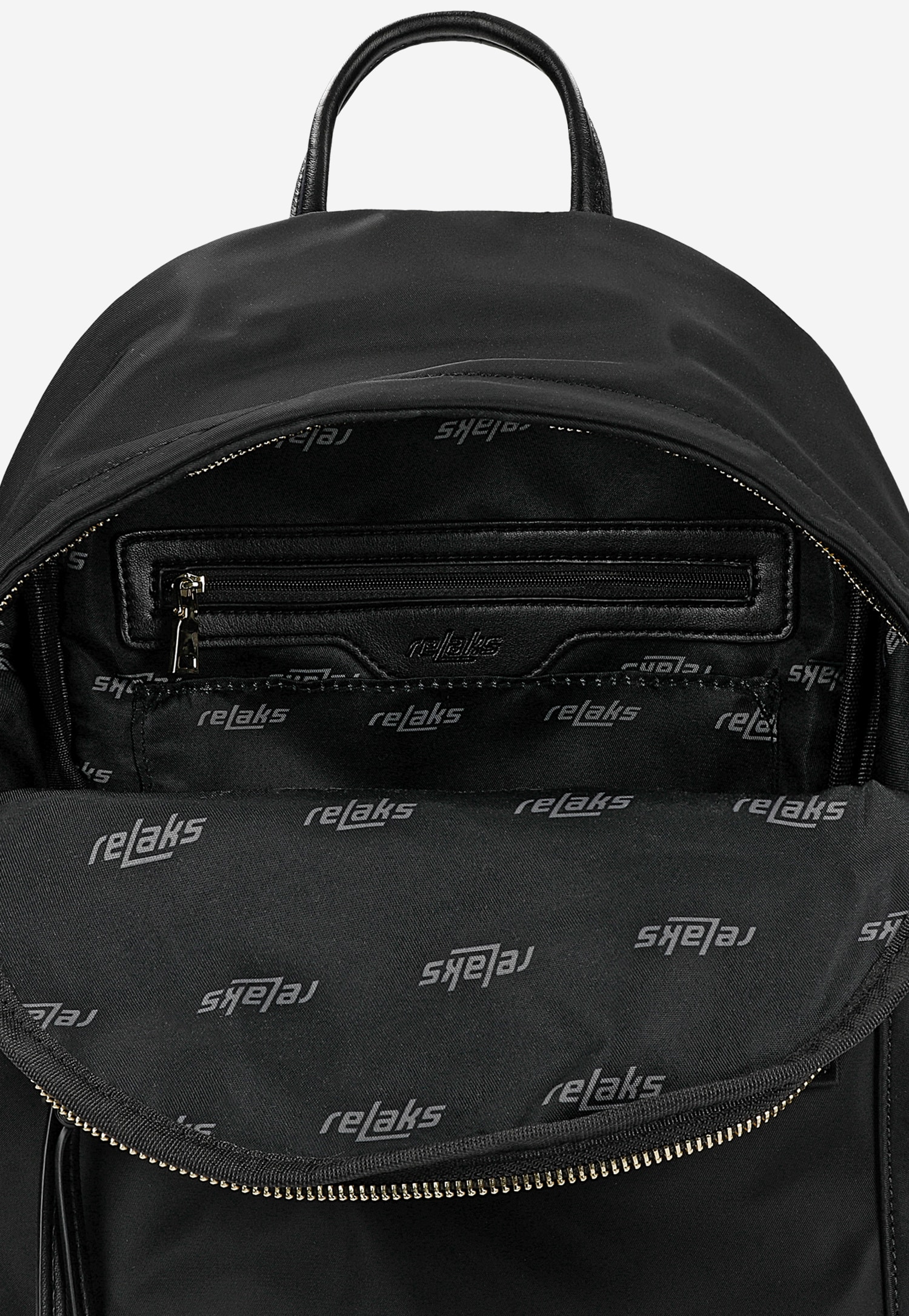 Czarny damski plecak RELAKS to połączenie funkcjonalności z uniwersalnym stylem urban. Wykonany w 100% z trwałego nylonu, sprawdzi się w każdych warunkach – od deszczowego poranka po słoneczne popołudnie. Materiał ten zapewnia lekkość i odporność na codzienne intensywne użytkowanie.