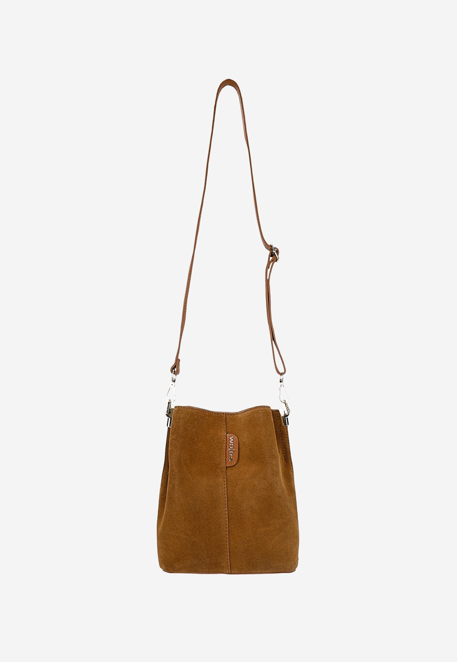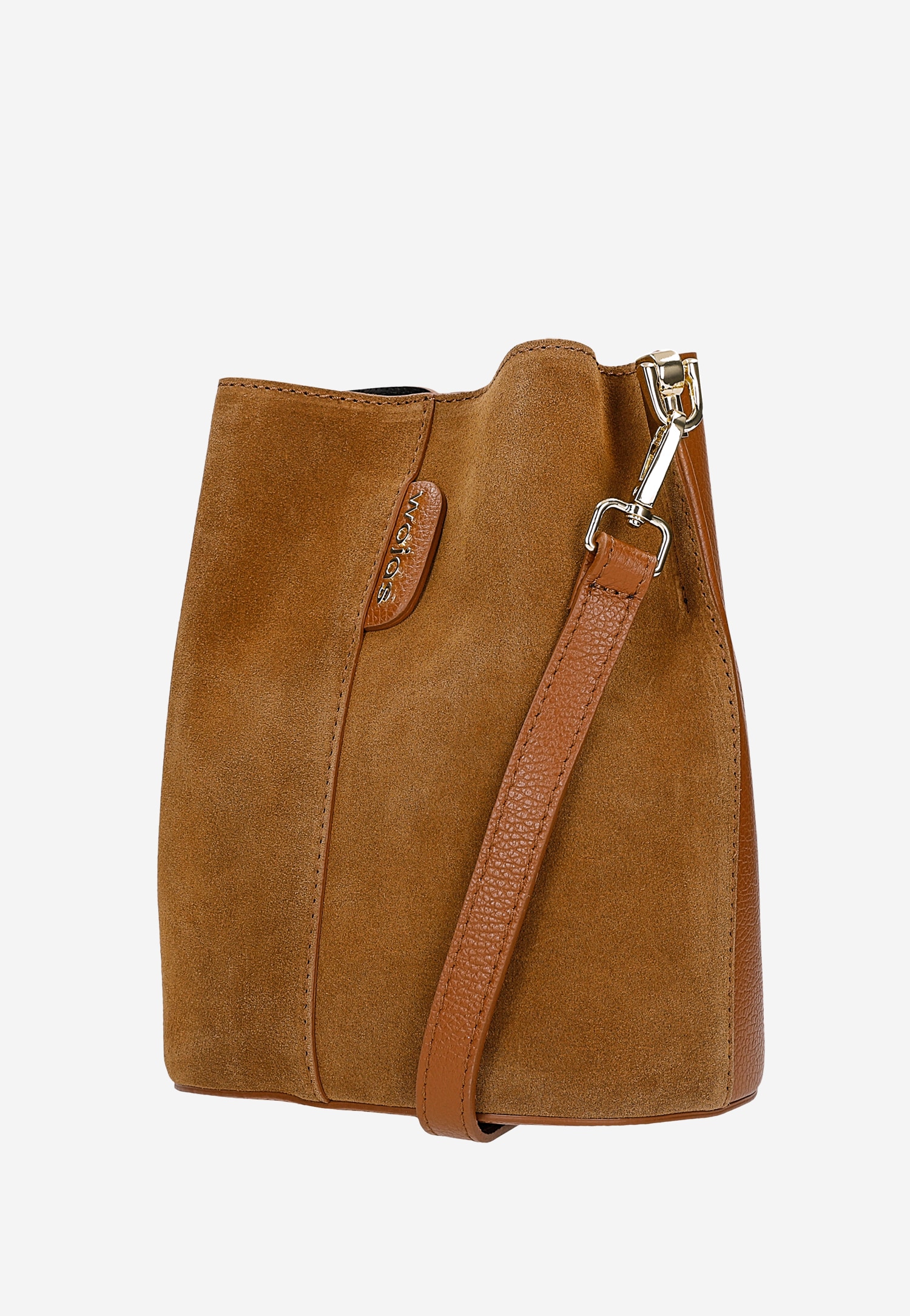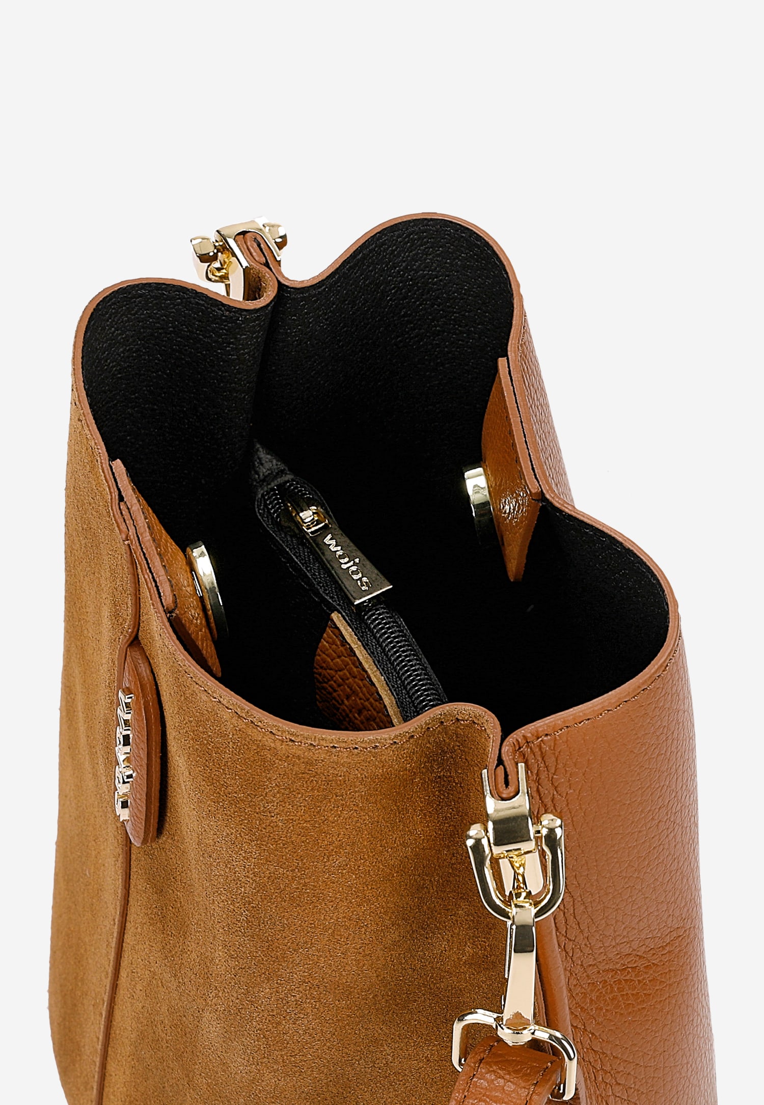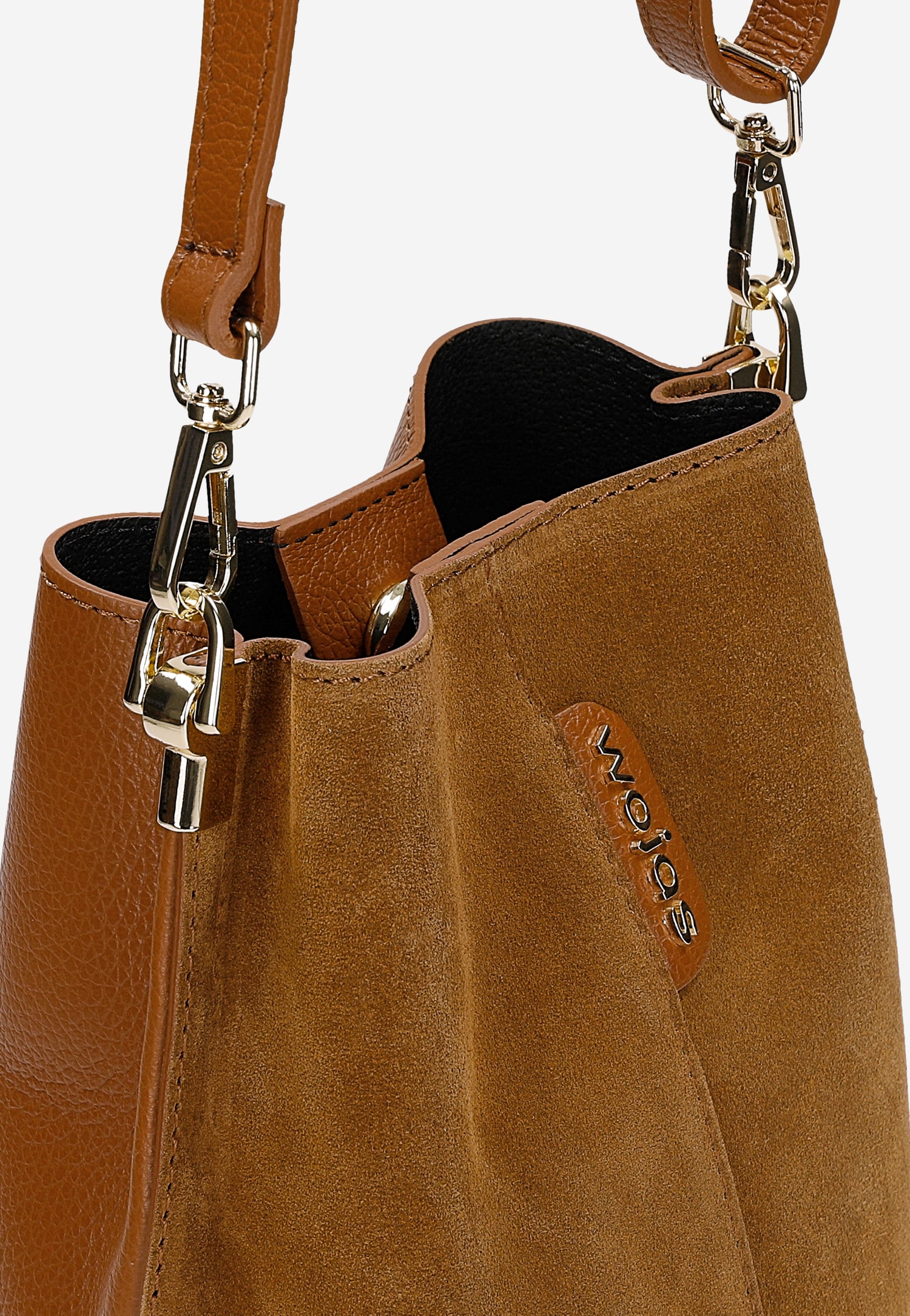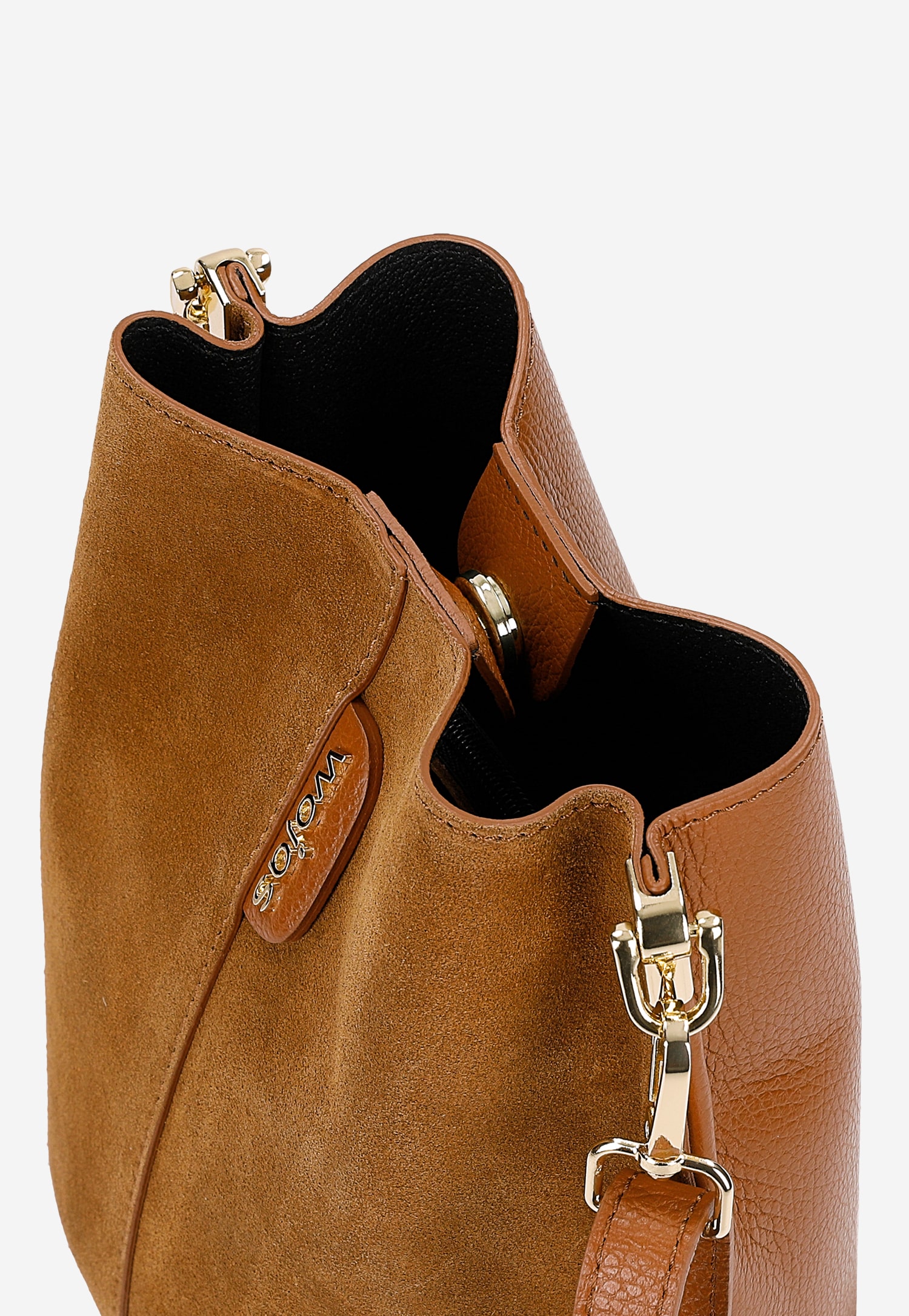 Ta jasnobrązowa torebka typu worek łączy naturalną elegancję skóry licowej z welurową dwoiny, tworząc harmonijną kompozycję faktur i kolorów. Model o uniwersalnym charakterze sprawdzi się zarówno w biurze, jak i podczas weekendowych spotkań ze znajomymi.