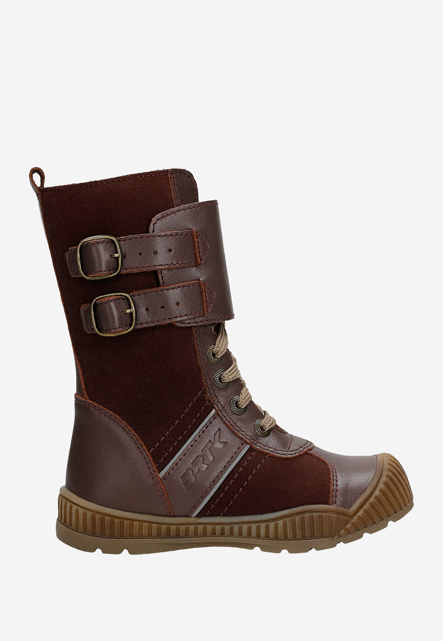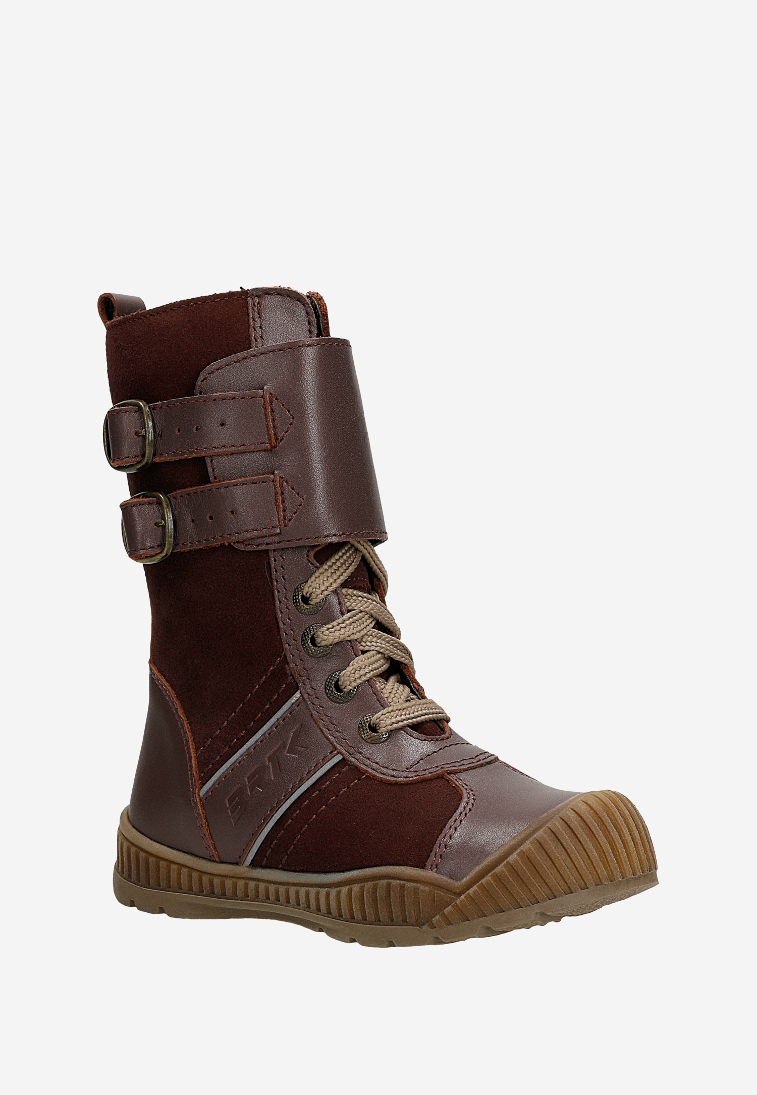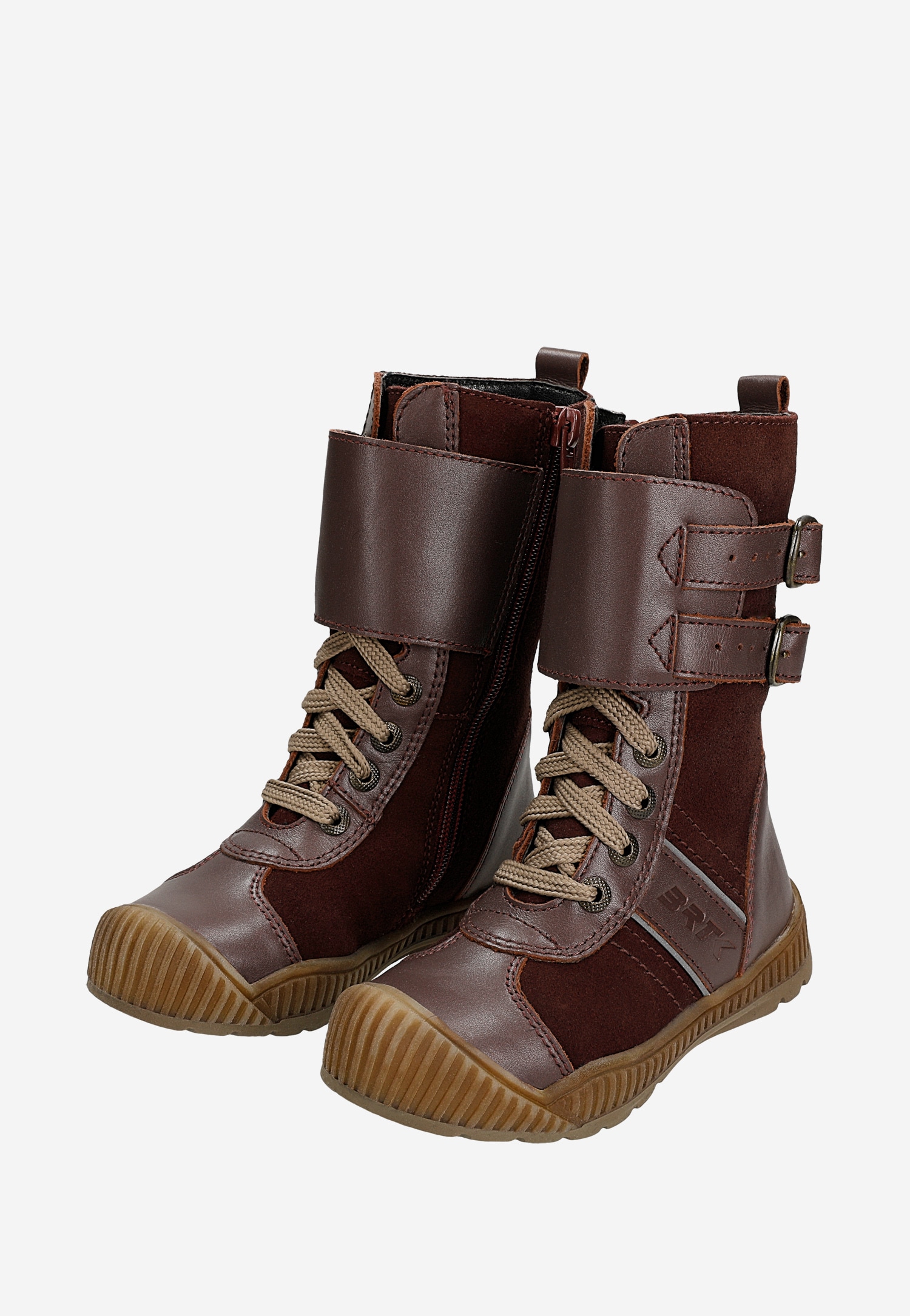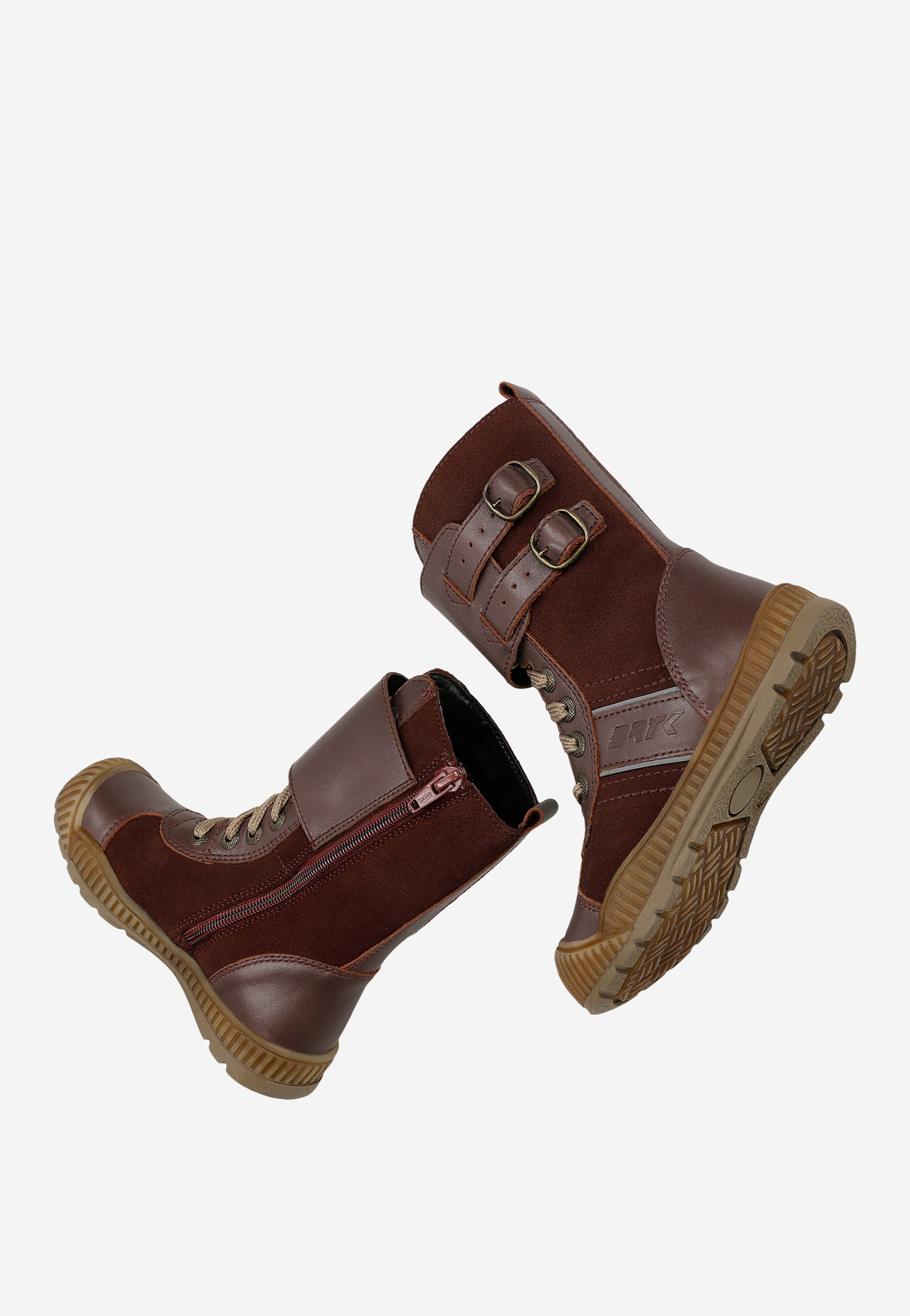 Modne buciki z wysoką cholewką, zapinane na klasyczne sznurowadła i wszyte po bokach suwaki oraz sprzączki, w sam raz na mroźne, zimowe dni, spacery i zabawy na śnieżnym puchu.