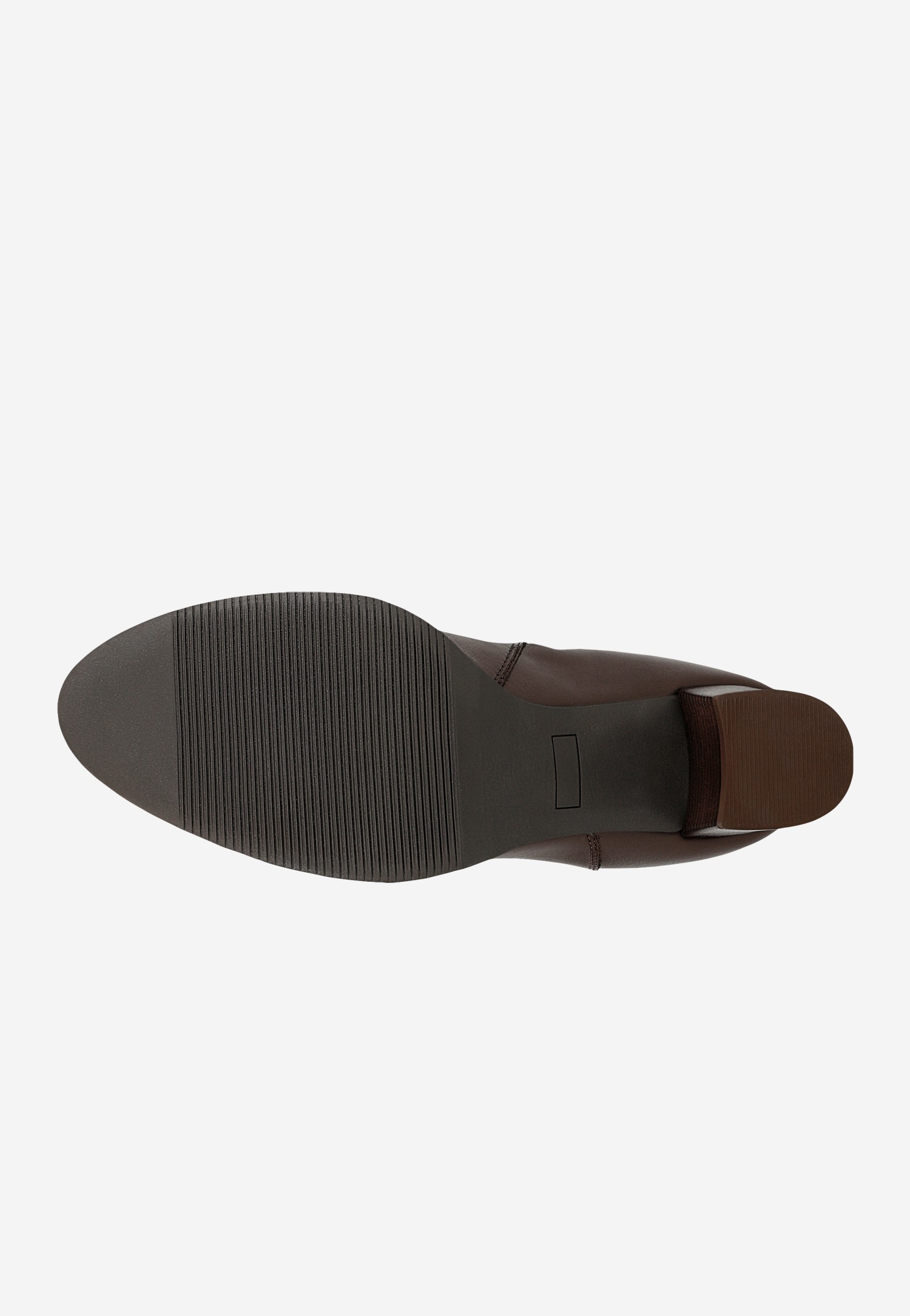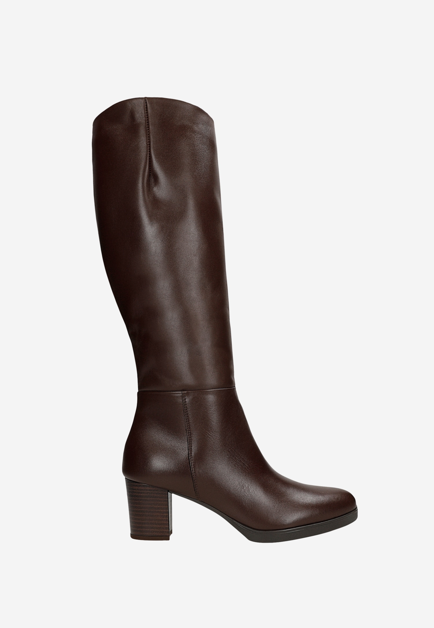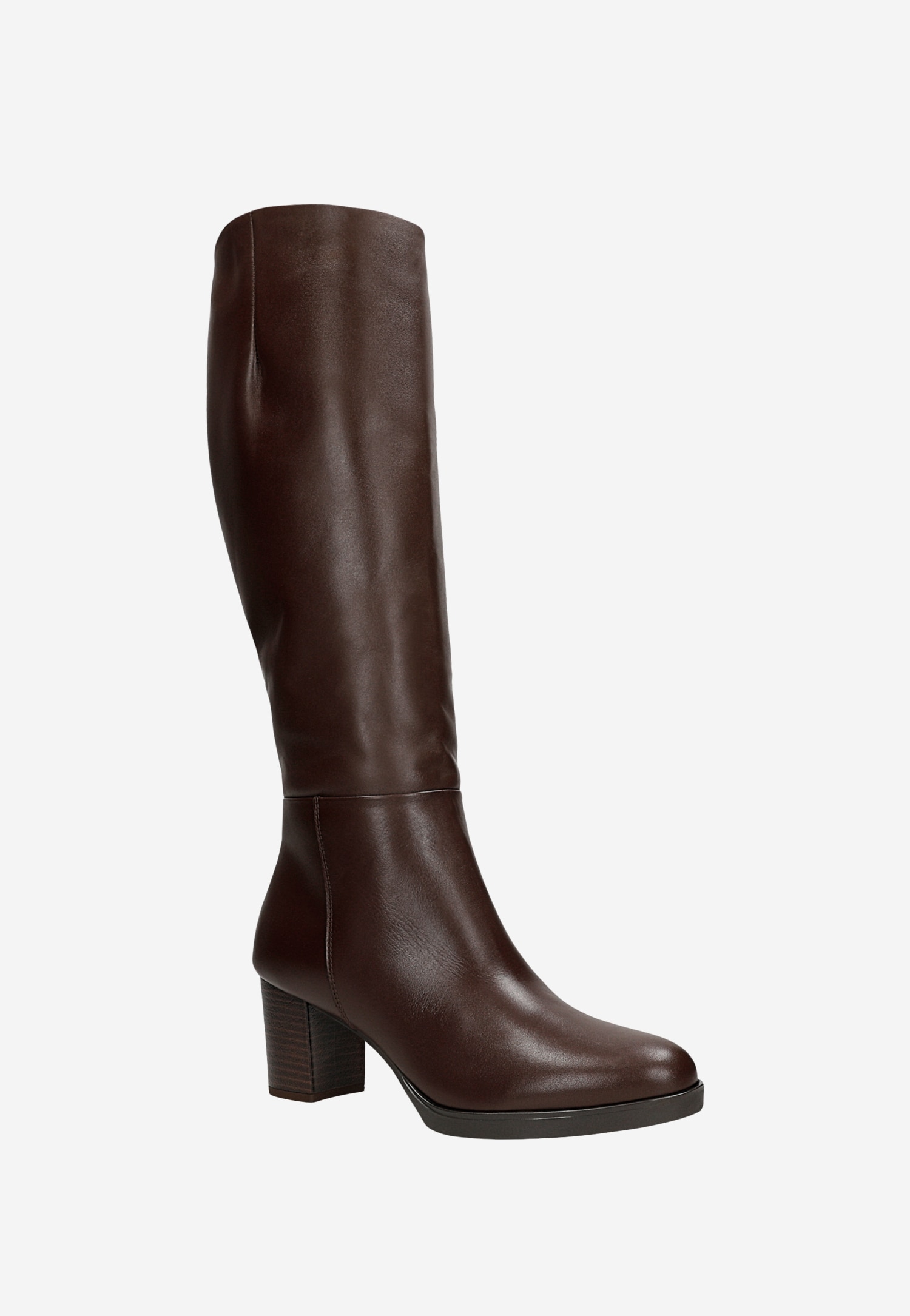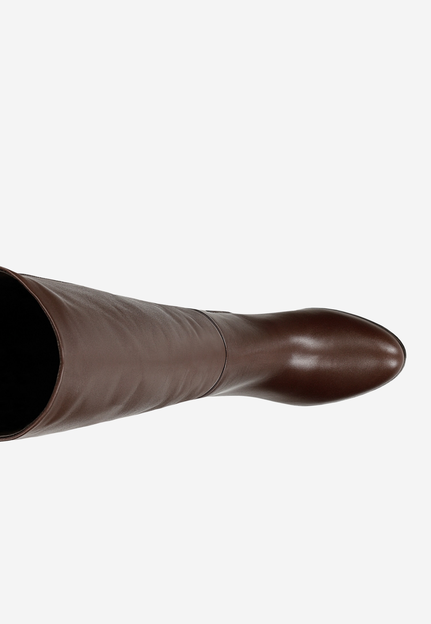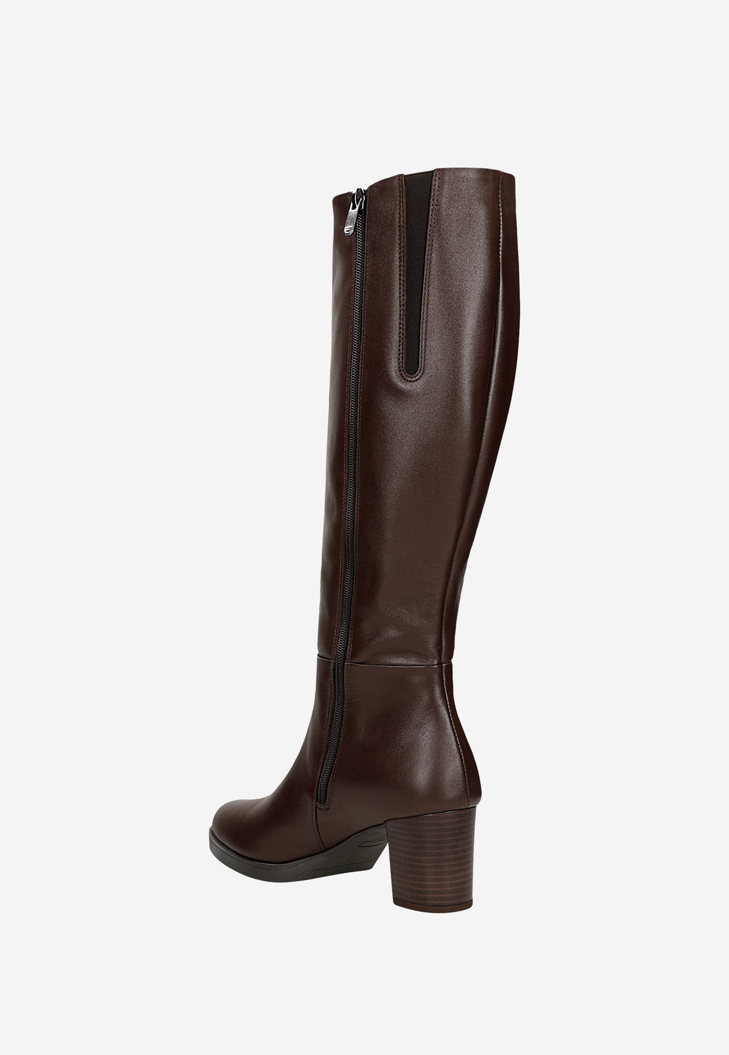Kozaki damskie wykonane z naturalnej skóry licowej w kolorze brązowym. Wyposażone w stabilny obcas o wysokości 6,5cm, zapewniający komfort użytkowania przy dłuższym noszeniu. Wnętrze wykończone jest miękką skórzaną podszewką, która poprawia wygodę. Solidna podeszwa z odpornego na ścieranie tworzywa gwarantuje przyczepność na różnych nawierzchniach.
