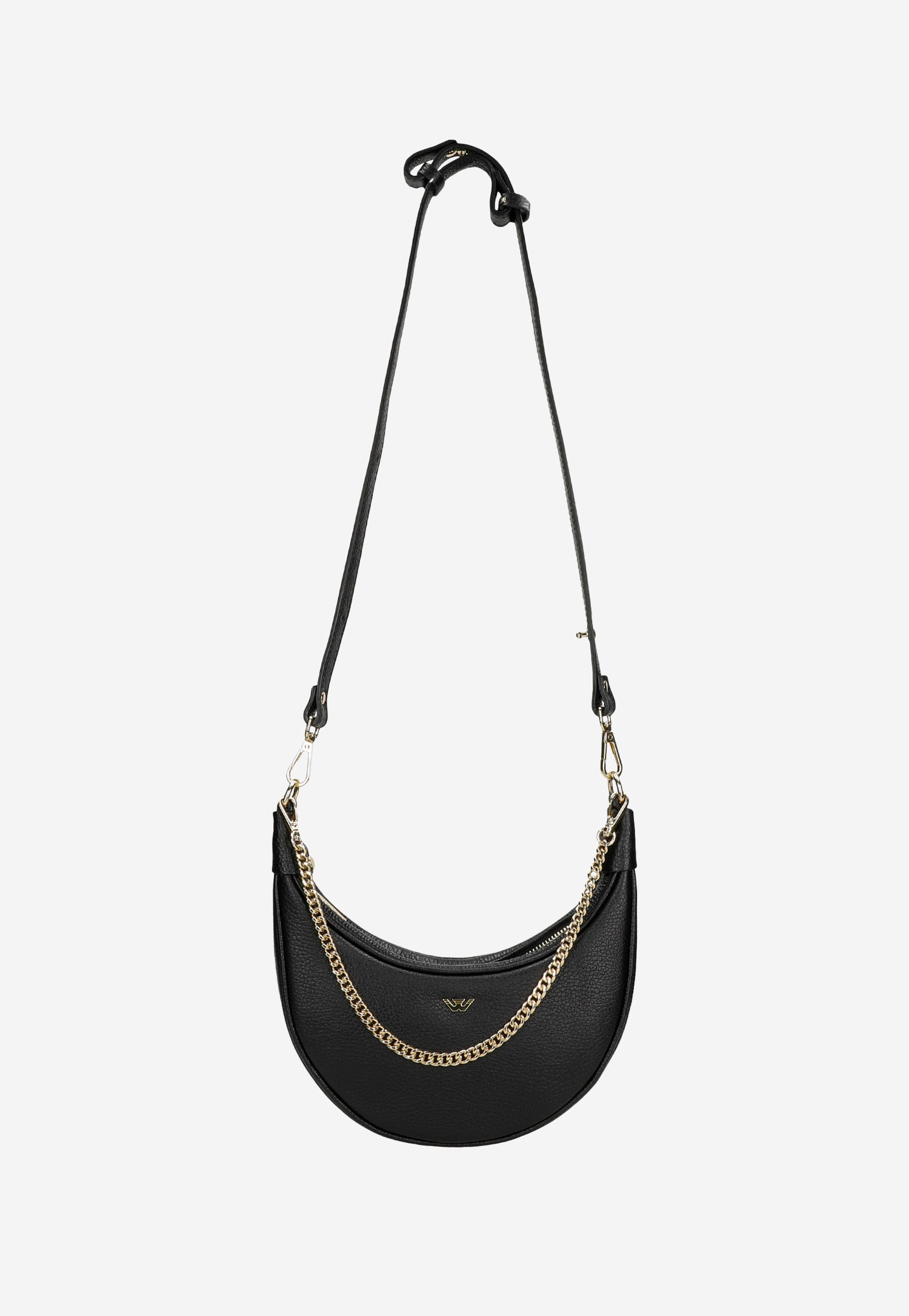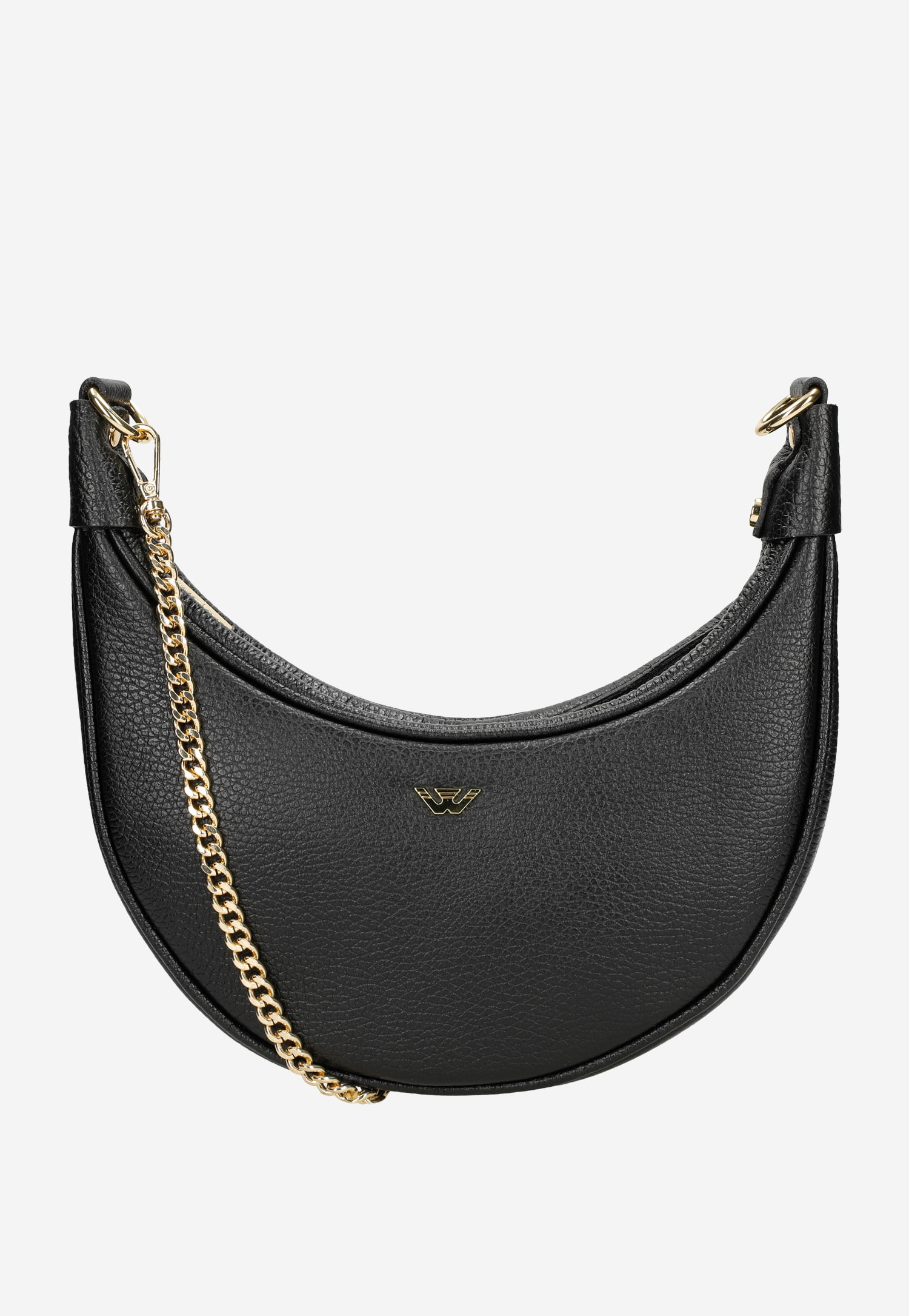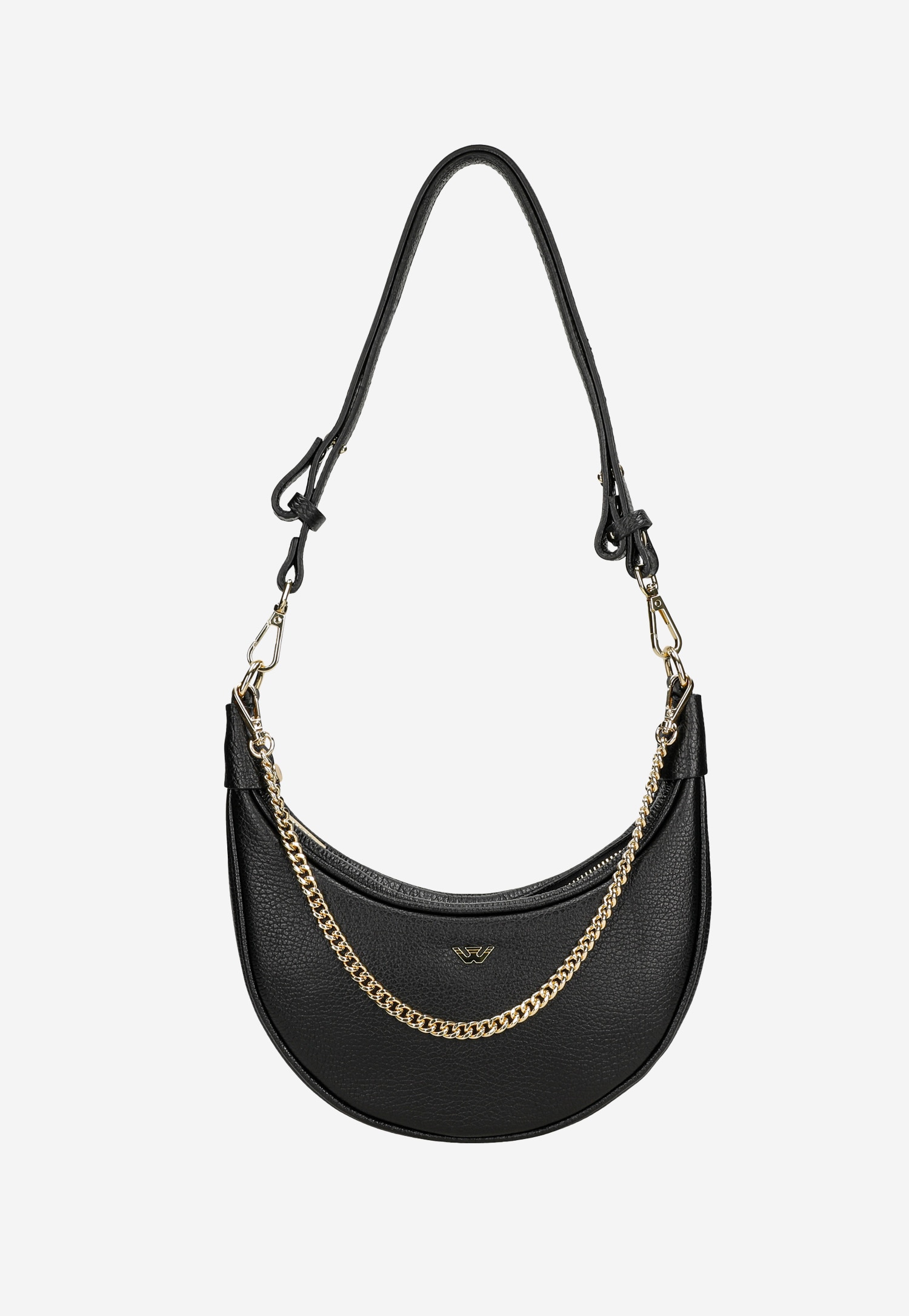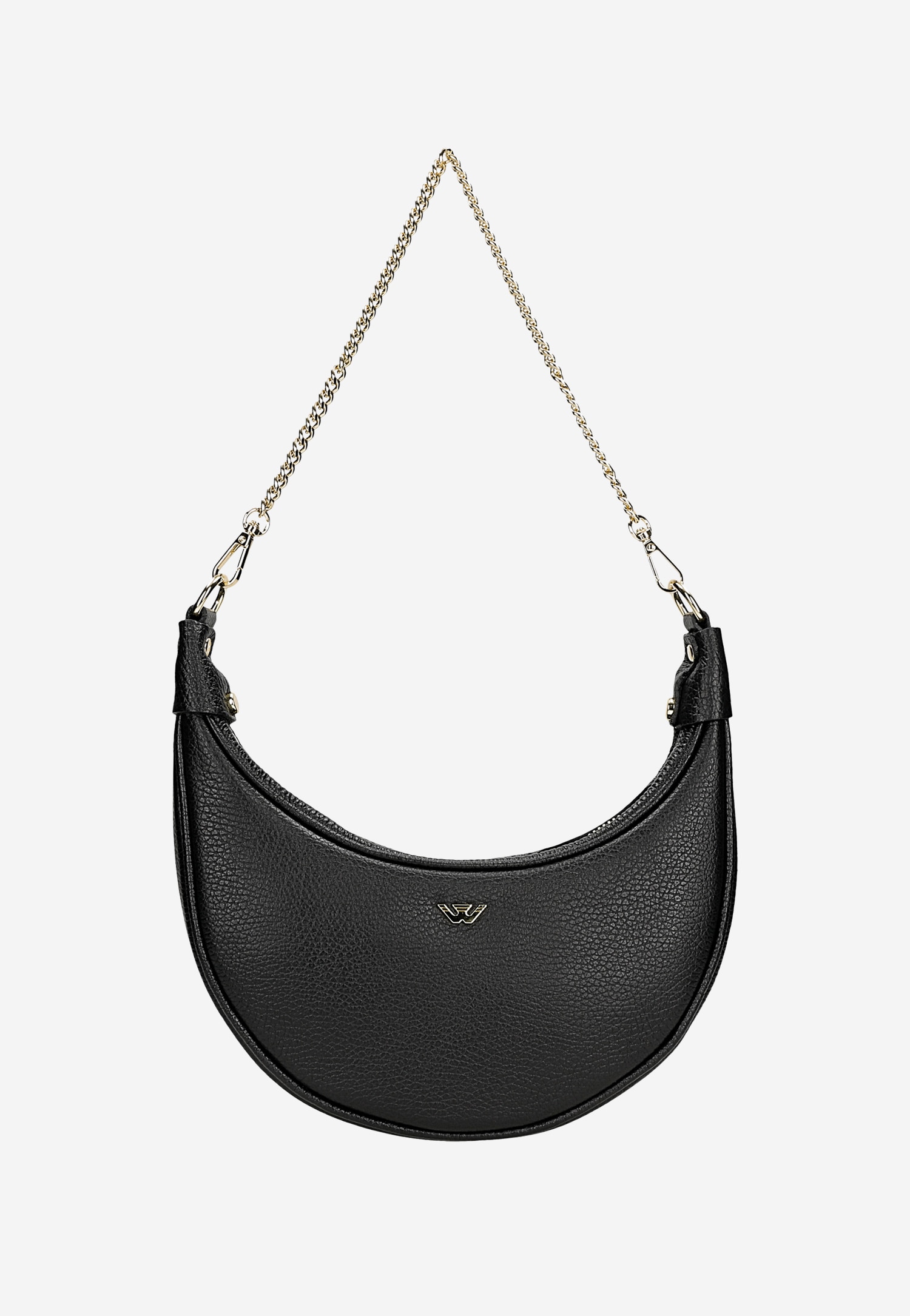 Elegancki złoty łańcuch pozwala nosić torebkę zarówno na ramieniu, jak i przewieszoną przez ramię, dodając stylizacji wyrafinowanego charakteru. Gładka skóra licowa w intensywnej czerni prezentuje się niezwykle elegancko i łatwo komponuje się z każdą garderobą.