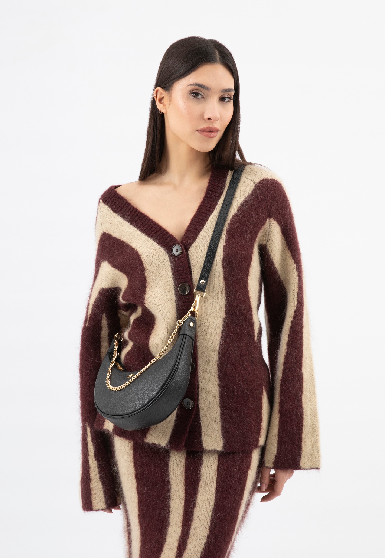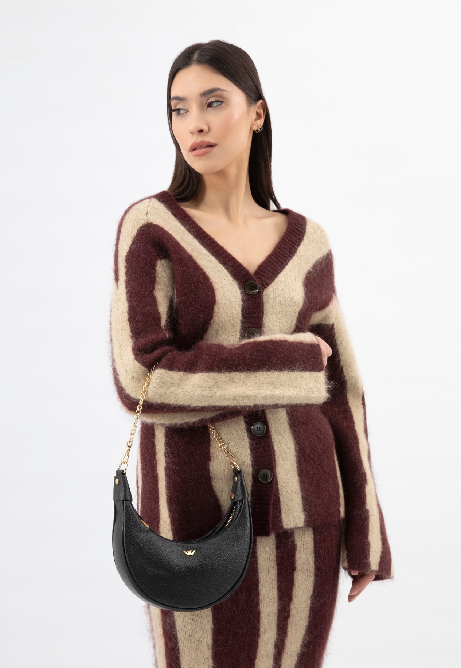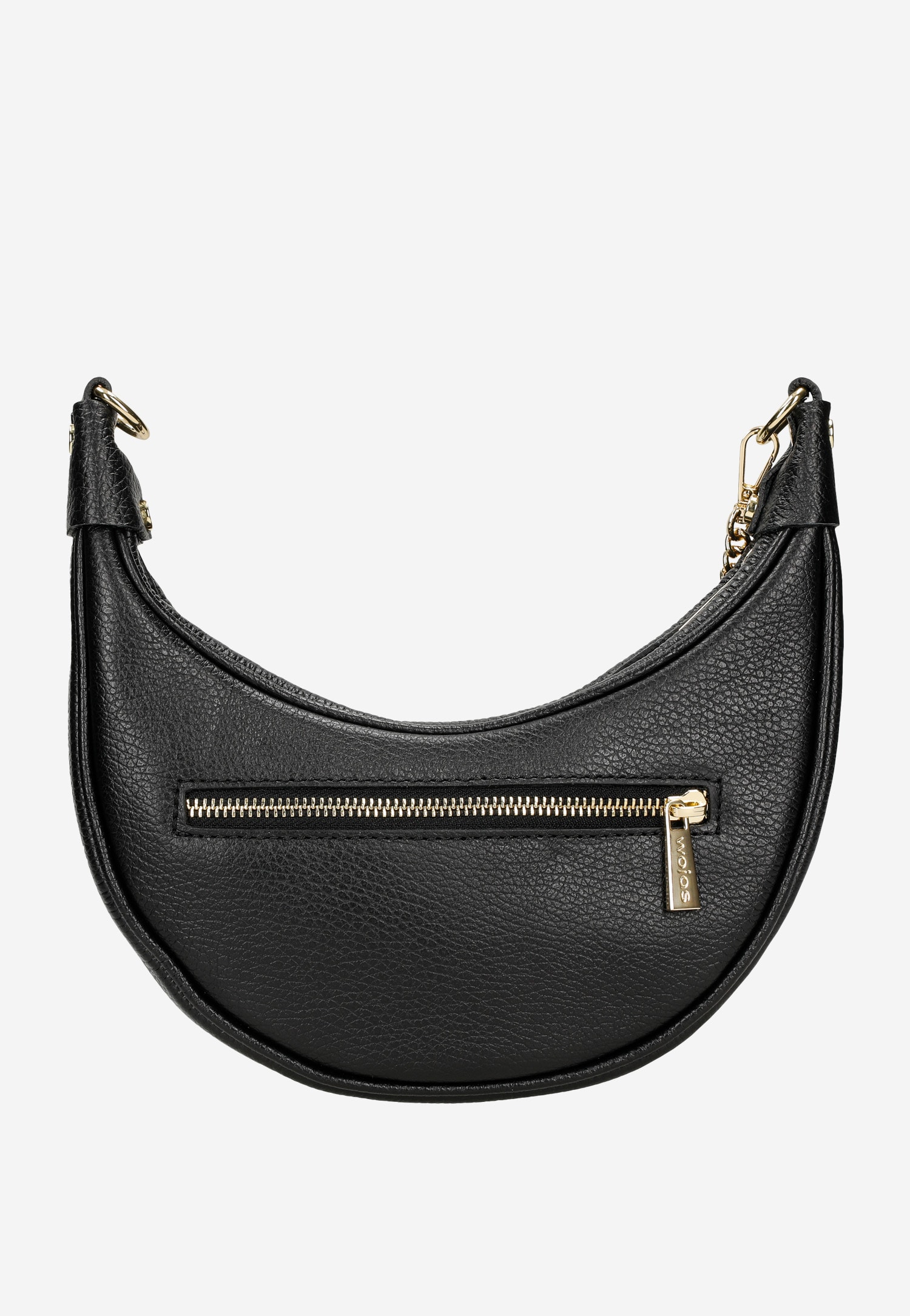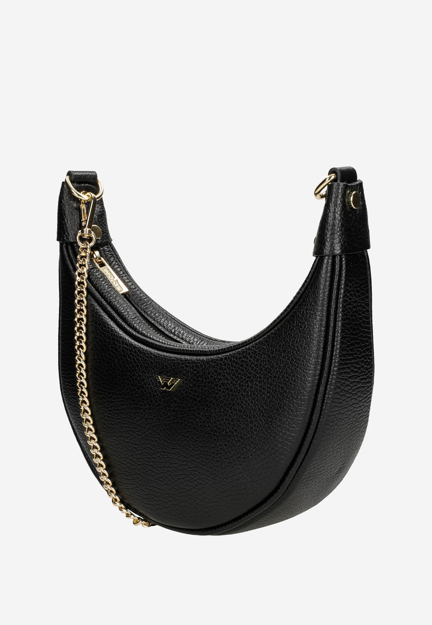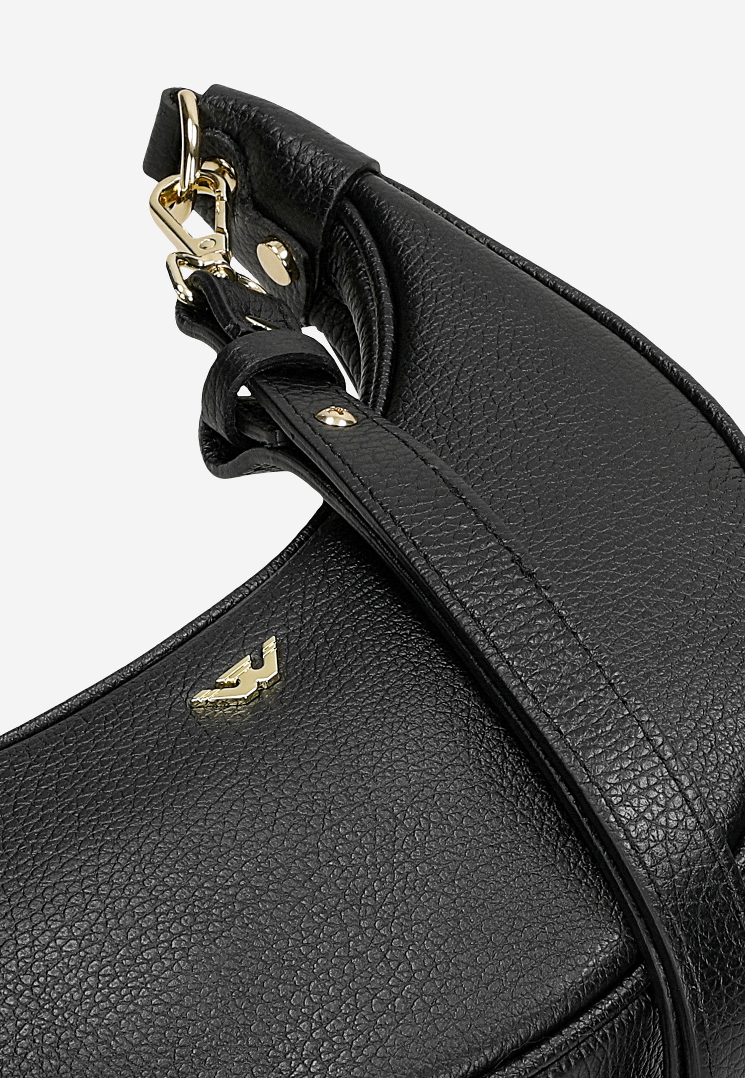 Elegancki złoty łańcuch pozwala nosić torebkę zarówno na ramieniu, jak i przewieszoną przez ramię, dodając stylizacji wyrafinowanego charakteru. Gładka skóra licowa w intensywnej czerni prezentuje się niezwykle elegancko i łatwo komponuje się z każdą garderobą.