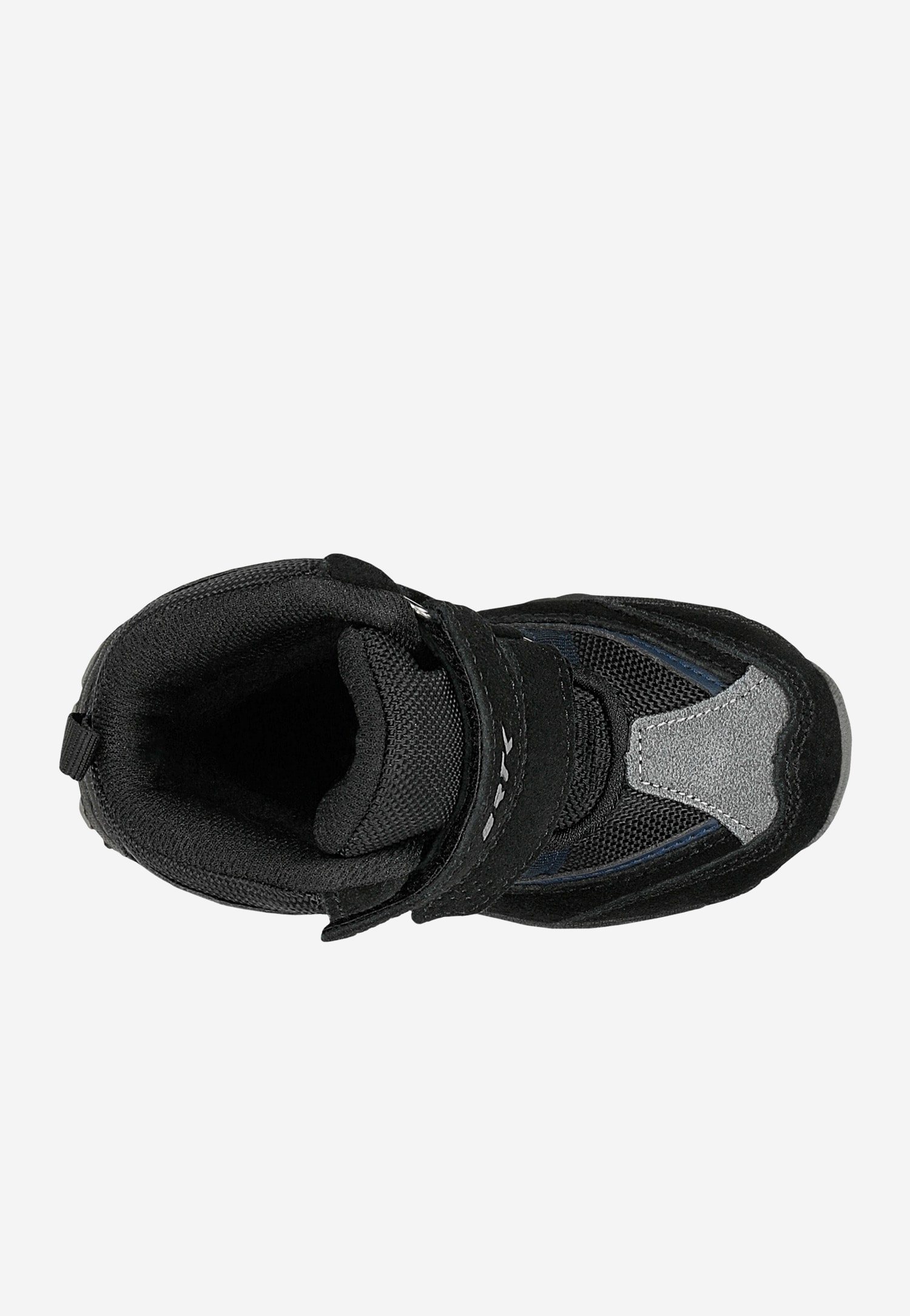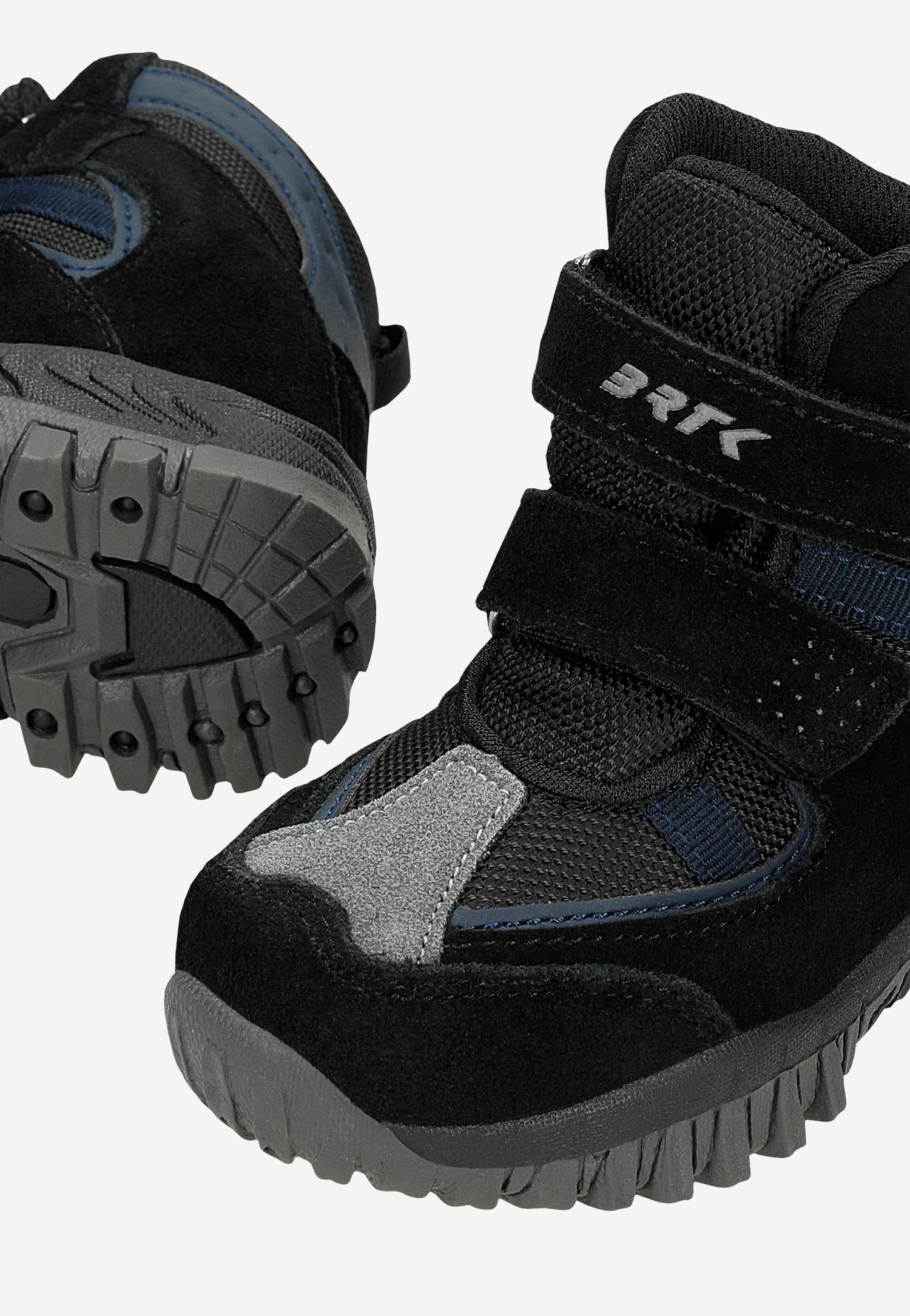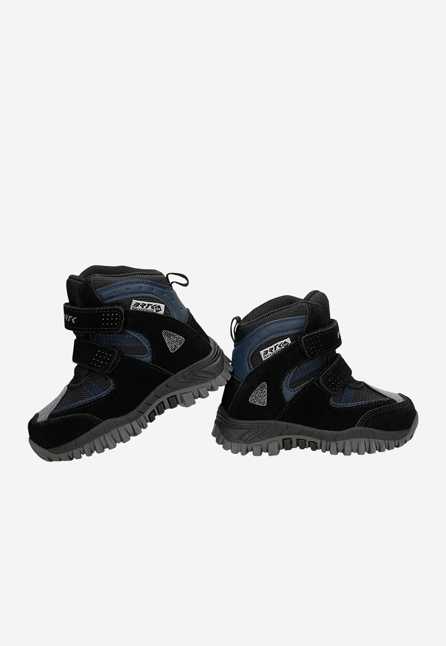 Trzewiki ocieplane BARTEK dla chłopców na sezon zimowy, w kolorze czarno-niebieskim. Obuwie przeznaczone dla najmłodszych klientów, małych wędrowników, odkrywców, szperaczy zaglądających w każdy zakątek, lubiących zabawy i spacery na świeżym powietrzu bez względu na pogodę. Idealnie sprawdzą się mroźną zimową porą.